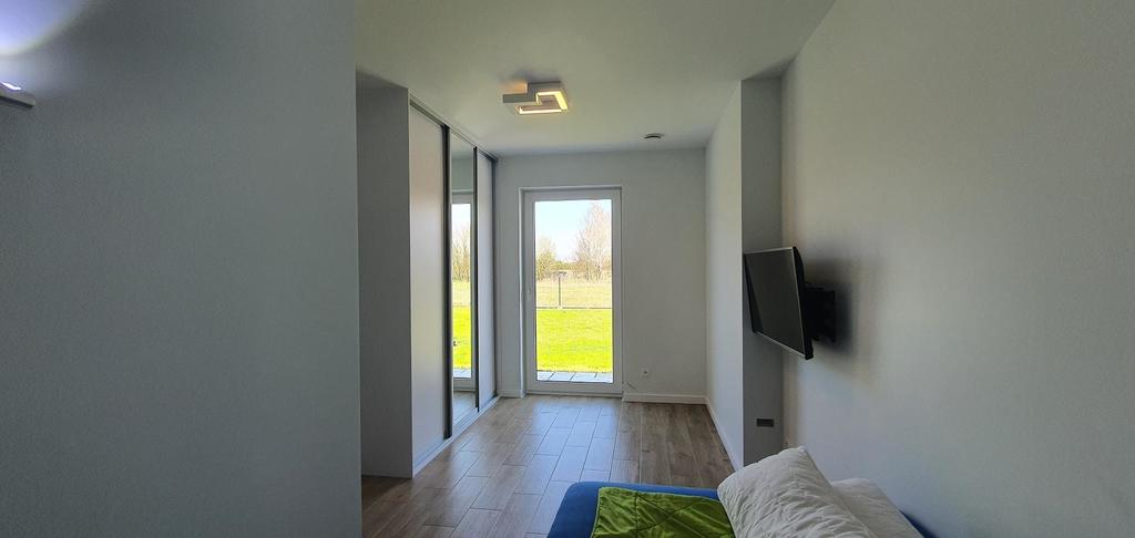 Sypialnie wyposażone są w małżeńskie łóżka oraz obszerne szafy w zabudowie. Zarówno z salonu, jak również z każdej sypialni można wyjść na ogród – z salonu poprzez taras (ok. 20 m2) wyłożony gresem.