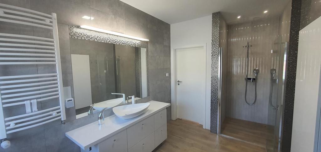 Pokój kąpielowy w wysokiej jakości glazurze i terakocie, z kabiną prysznicową typu walk-in (bez brodzika), nowoczesny biały montaż (toaleta bezkołnierzowa i bidet z ekskluzywnej serii ALESSI ONE marki LAUFEN oraz elegancka umywalka nablatowa). W toalecie dla gości, nad stelażem toalety dodatkowo zagospodarowano wnękę (szafka dwudrzwiowa).