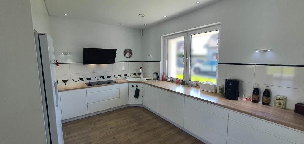 Kuchnia otwarta na salon, umeblowana w utrzymane w nowoczesnej stylistyce meble w zabudowie (mnóstwo szafek i szuflad), wyposażona w płytę grzewczą indukcyjną, elektryczny piekarnik, nowoczesną, dwudrzwiową lodówkę z zamrażarką (z kostkarką do lodu), zmywarkę, okap i zlew. Długie powierzchnie robocze (blaty) zapewniają dużą ilość miejsca do przygotowanie posiłków.