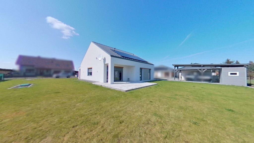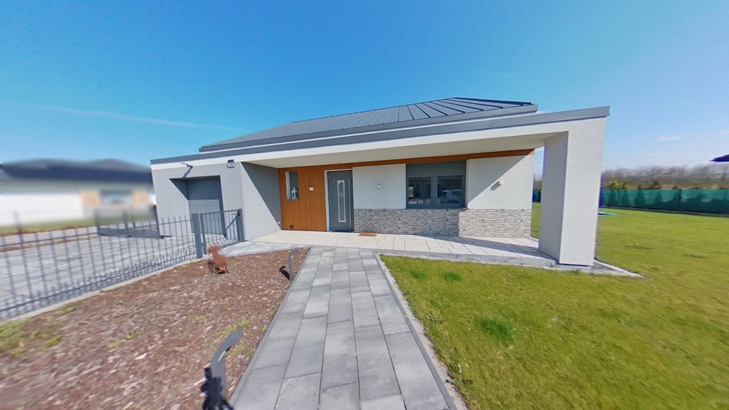 Dom położony na działce o powierzchni 1001 m2, wykończony z dbałością o szczegóły (nowoczesne lampy i kontakty, liczne punkty świetlne LED). Projekt domu oparty na projekcie RALF G1 studia ARCHIPELAG – nowoczesna bryła, duże przeszklenia w strefie dziennej, duża część ogrodu widoczna z wnętrza domu.