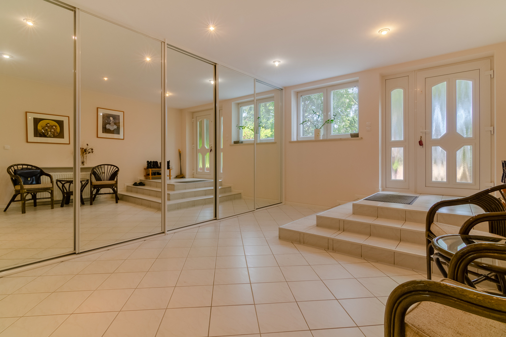 Gdy przejdziemy przez ogród obsadzony rosłymi drzewami i przekroczymy próg to znajdziemy się w dużym holu z 5-metrową zabudowaną szafą. Stamtąd możemy przejść do pomieszczenia rekreacyjnego (ze stołem bilardowym), są tam również zamontowane systemy grzewcze, tj. piec na olej opałowy oraz piec gazowy z nowym 2-obiegowym kotłem, których można używać naprzemiennie. Z „bilardowego” wejdziemy do garaży. Na parterze również duża spiżarnia, wyjście na duży taras oraz schody dębowe z metalową konstrukcją.