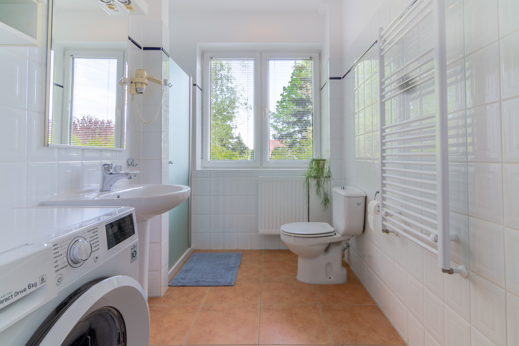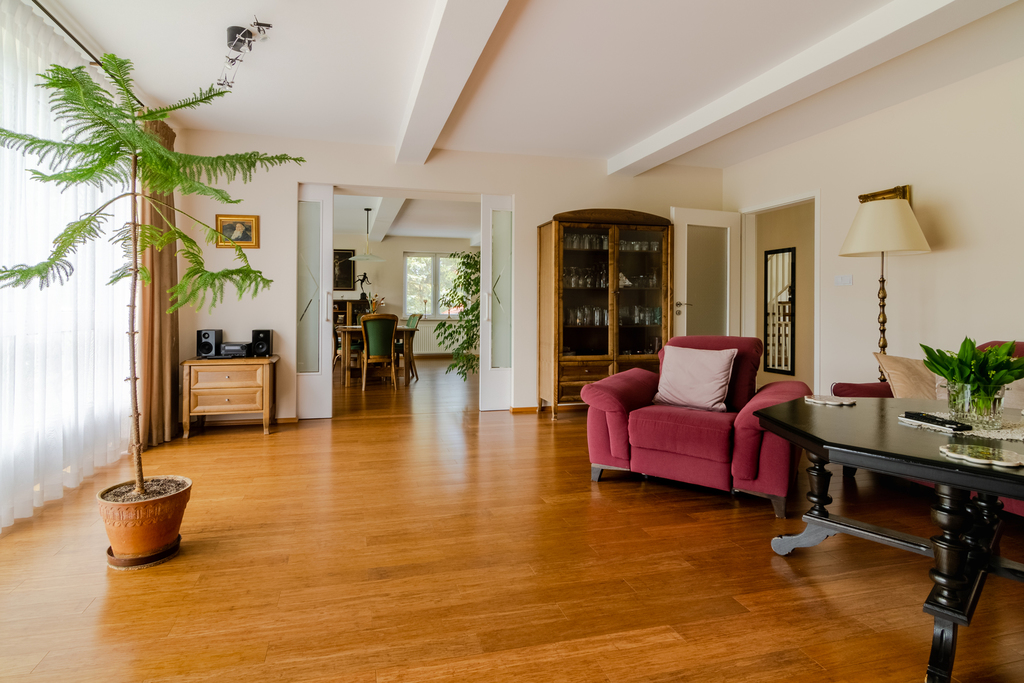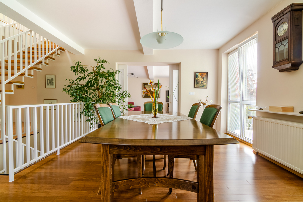Zaprowadzą nas na I piętro. Część dzienna domu to duża, jasna i otwarta przestrzeń z widokiem na las. Wyjście na taras. W ubiegłym roku odświeżono ściany, wymieniono podłogi. Na podłodze wysokiej jakości deska bambusowa w pokojach oraz płytki w korytarzu. Na tym poziomie z korytarza wejdziemy też do oddzielnej kuchni, schowka, sypialni gościnnej oraz mniejszej łazienki z kabiną. Ciepła woda może pochodzić z przepływowych podgrzewaczy wody, co jest ekonomicznym rozwiązaniem, ponieważ budynek jest wyposażony w instalację fotowoltaiczną. Produkuje więcej energii niż jest w stanie zużyć dom.