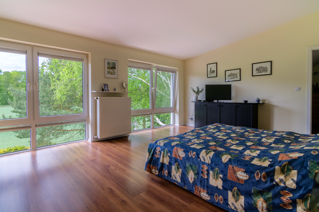 Na poddaszu 3 sypialnie: 2 mniejsze i 1 większą z garderobą i oknami do podłogi z widokiem na otwartą zieloną przestrzeń zamkniętą ścianą pobliskiego lasu. Salon kąpielowy z wanną, bidetem i wydzieloną częścią kosmetyczno-pielęgnacyjną.