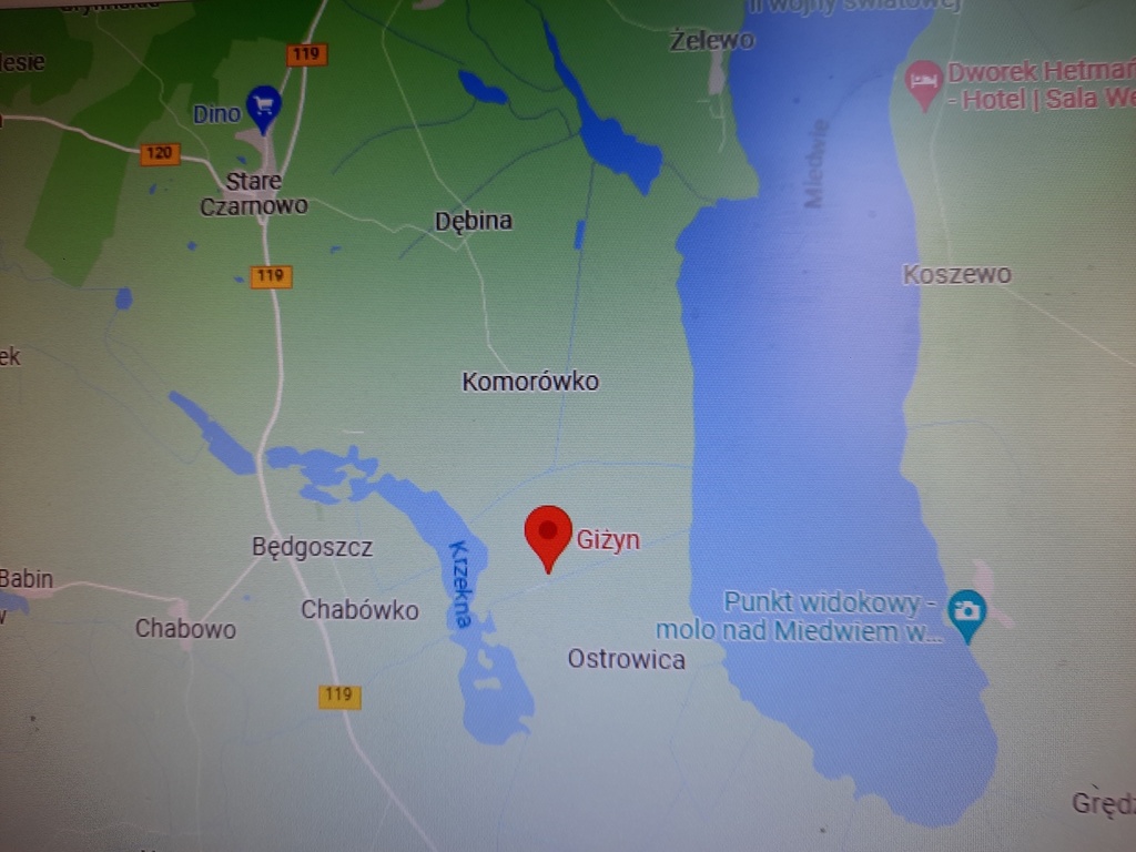 Działka rolna o powierzchni 3000 m2 położona w miejscowości Giżyn (niem. Giesenthal, tłum. dosłowne rozlewisko, zlewisko).