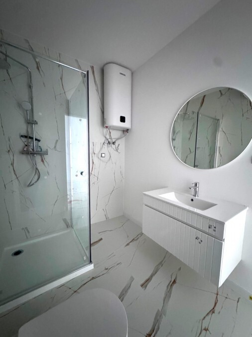* W skład wykończenia wchodzi: ściany wygładzone i pomalowane na biało, ogrzewanie podłogowe elektryczne – maty grzewcze, panele w salonie i sypialni, drzwi do sypialni i łazienki w kolorze białym, oświetlenie, łazienka w pełni wykończona: kafle, umywalka z szafką, lustro, wc, kabina prysznicowa, piec elektryczny do ogrzewania ciepłej wody. Cena nie obejmuje zabudowy kuchni oraz mebli pokojowych.