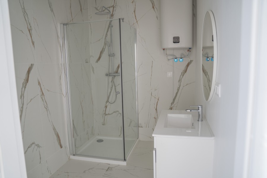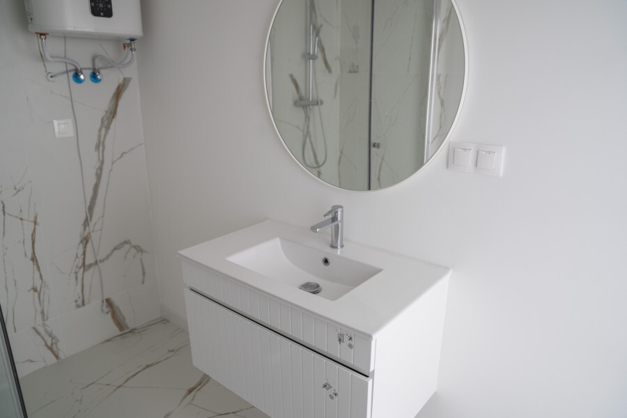 * W skład wykończenia wchodzi: ściany wygładzone i pomalowane na biało, ogrzewanie podłogowe elektryczne – maty grzewcze, panele w salonie i sypialni, drzwi do sypialni i łazienki w kolorze białym, oświetlenie, łazienka w pełni wykończona: kafle, umywalka z szafką, lustro, wc, kabina prysznicowa, piec elektryczny do ogrzewania ciepłej wody. Cena nie obejmuje zabudowy kuchni oraz mebli pokojowych.