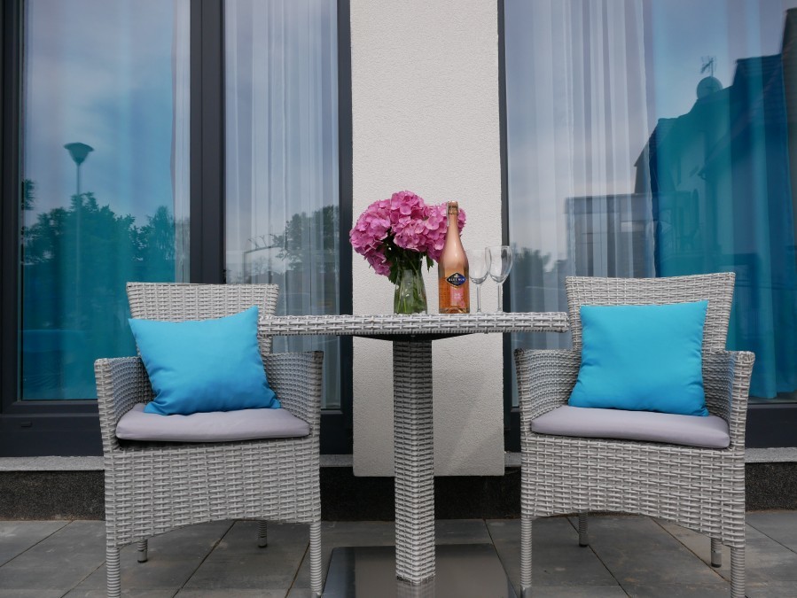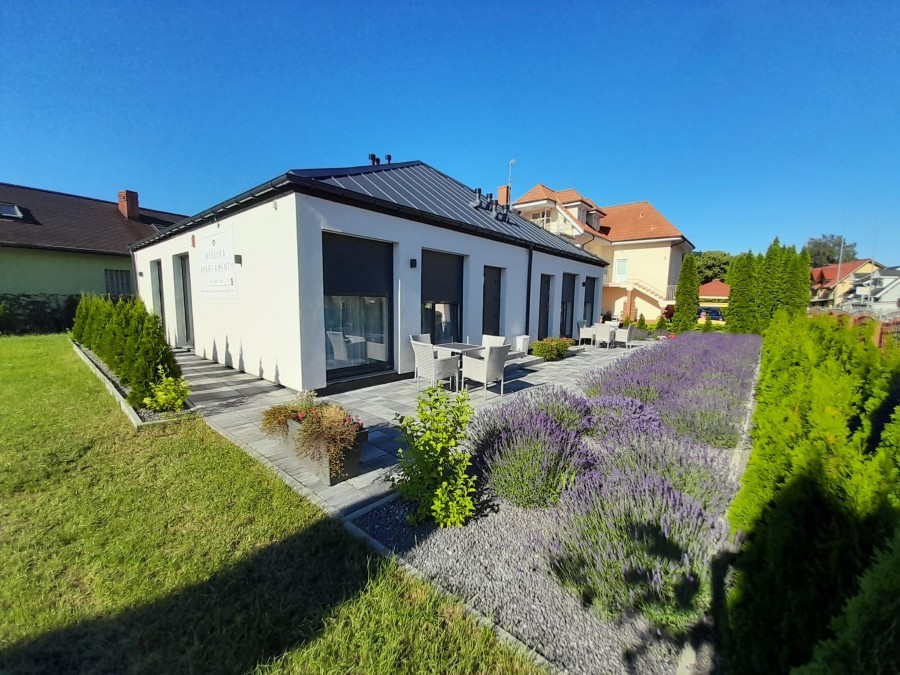 W każdym z apartamentów znajduje się: w salonie kanapa, stolik kawowy, stół z czterema krzesłami, telewizor smart TV, w sypialni łóżko dwuosobowe, aneks kuchenny wyposażony w zabudowę szafek kuchennych, płytę grzewczą 2 – palnikową, lodówkę 60, oraz szafa dwudrzwiowa z lustrami. Ogrzewanie elektryczne podłogowe, jak również woda z pieca elektrycznego firmy Ariston sterowany zdalnie przez wi-fi. Meble ogrodowe oraz 4 miejsca parkingowe na działce.