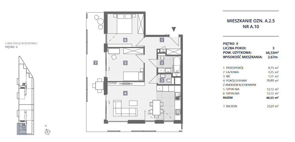 Na ofertę składa się komfortowy, jasny apartament z trzema pokojami o przestrzeni 66.53 m², w skład którego wchodzą:
