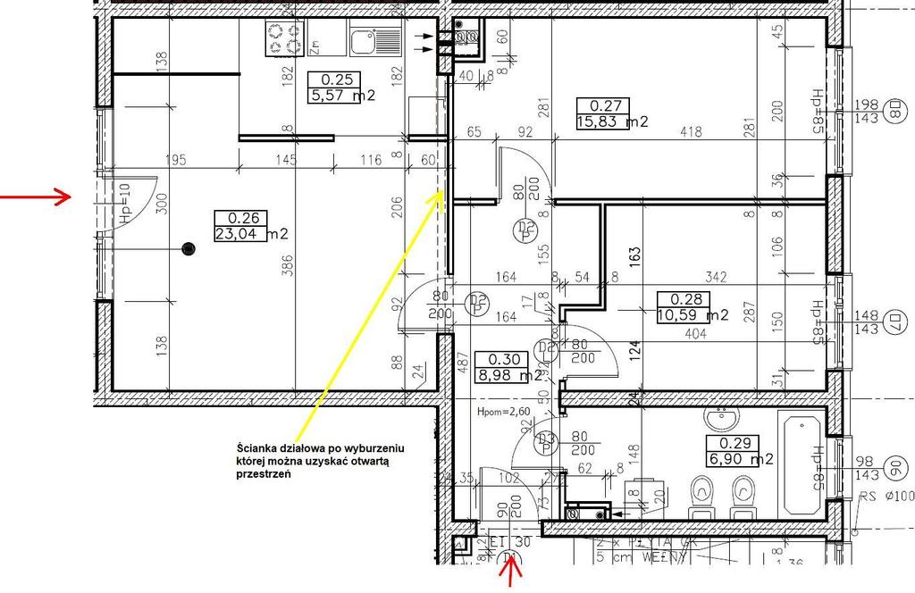 Obie części przedzielone są jedynie ścianką działową – możliwe jest jej usunięcie i połączenie obu stref w celu uzyskania pierwotnego podziału pomieszczeń na mieszkanie 3 pokojowe.