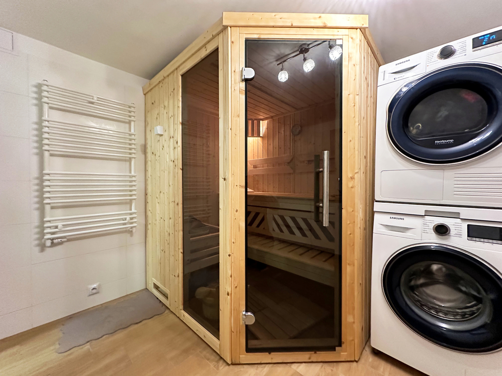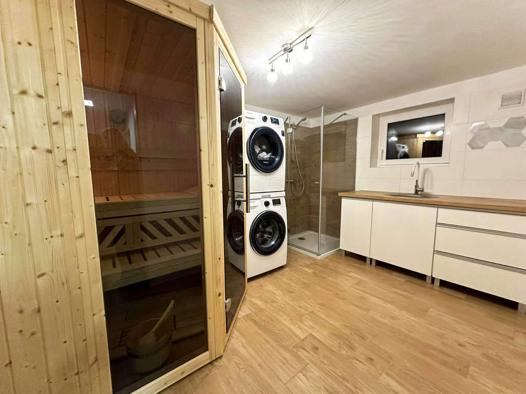 • Dodatkowe udogodnienia:Do nieruchomości przynależy obszerny garaż natomiast w piwnicy oprócz praktycznej pralni, znajdują się tam sauna, drugi kominek, prysznic i toaleta.