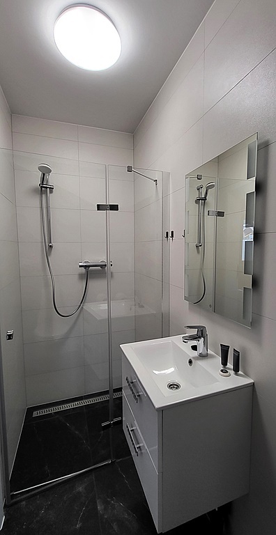 – Parter – salon z aneksem kuchennym, łazienka z toaletą i prysznicem oraz taras,