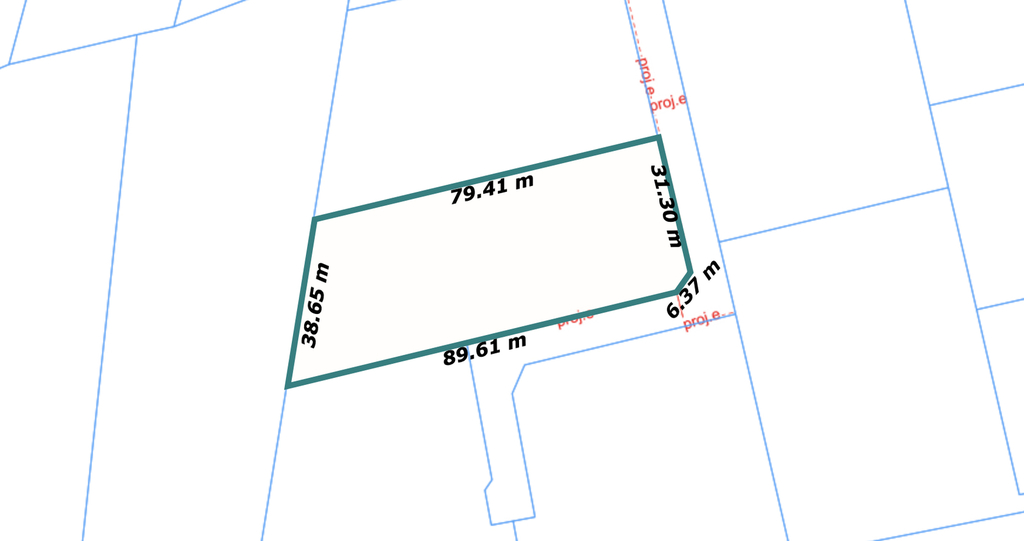 Kształt działki zbliżony do trapezu, wymiary: ok. 80m x 30m.