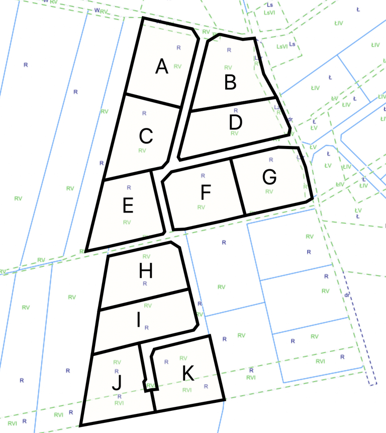 Dostępnych jest łącznie 7 działek z wydanymi warunkami zabudowy oznaczone jako „A”-„G” (3023m2; 3115m2; 3128m2; 3181m2; 3211m2; 3235m2 oraz 3405m2) oraz 4 zalesione działki bez wydanych warunków zabudowy oznaczone jako „H”-„K” (3039m2; 3044m2 3045m2 oraz 3121m2).