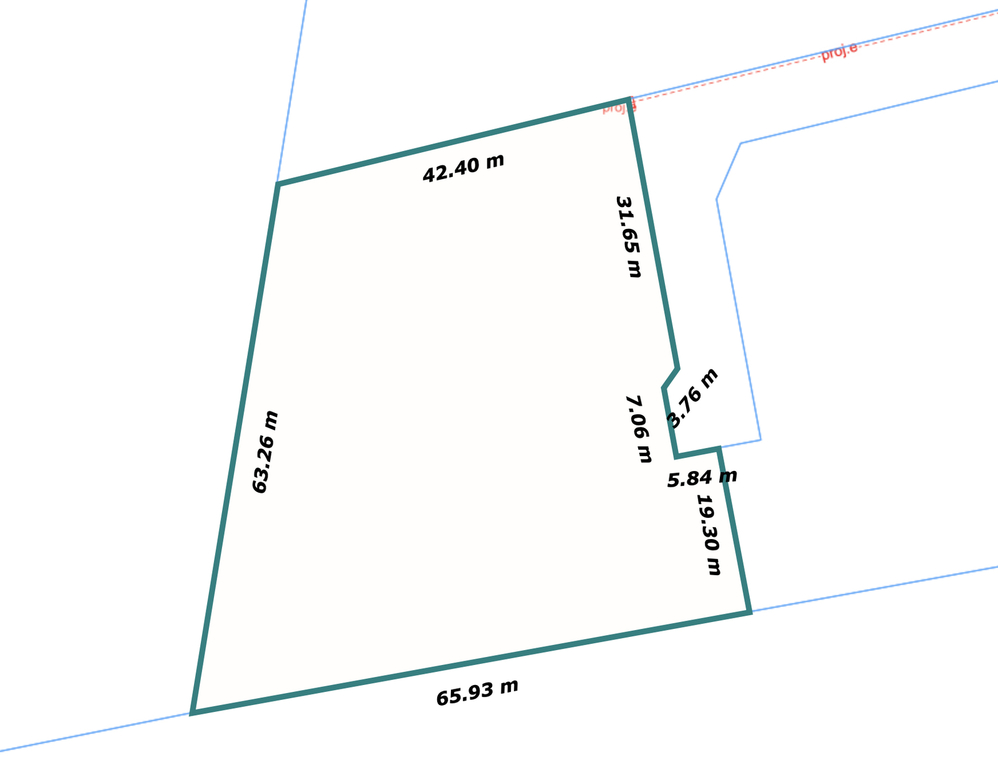 Kształt działki zbliżony do trapezu, wymiary: ok. 40m x 50m.