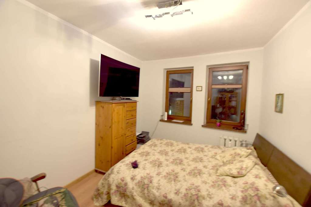 W pokojach na podłodze panele, w przedpokoju oraz w kuchni terakota, ściany gładkie malowane.
