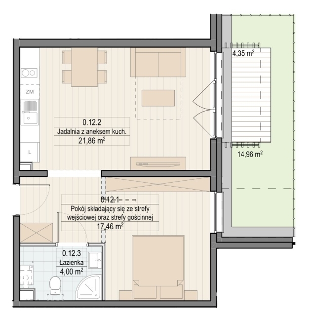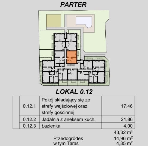 Apartament będący przedmiotem tej oferty znajduje się na parterze i ma powierzchnię 43,32 m2. Składa się z salonu z aneksem kuchennym, sypialni, garderoby, łazienki i przedpokoju.