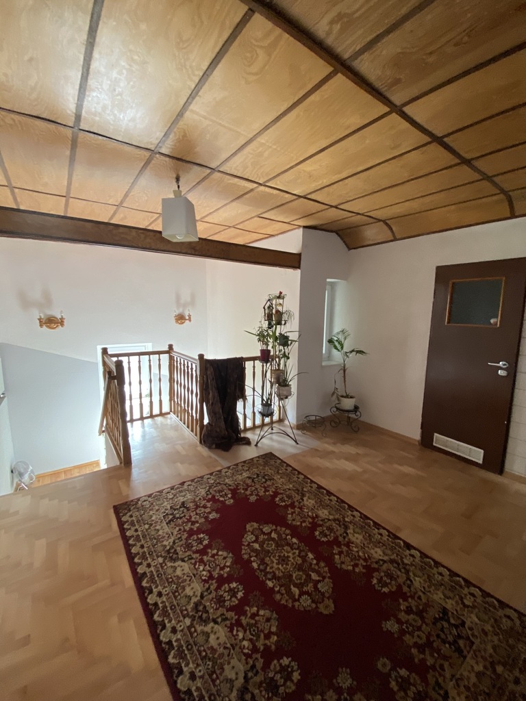 Piętro- 4 pokoje, z jednego z nich wyjście na przestronny taras, z innego na balkon, wc, łazienka.