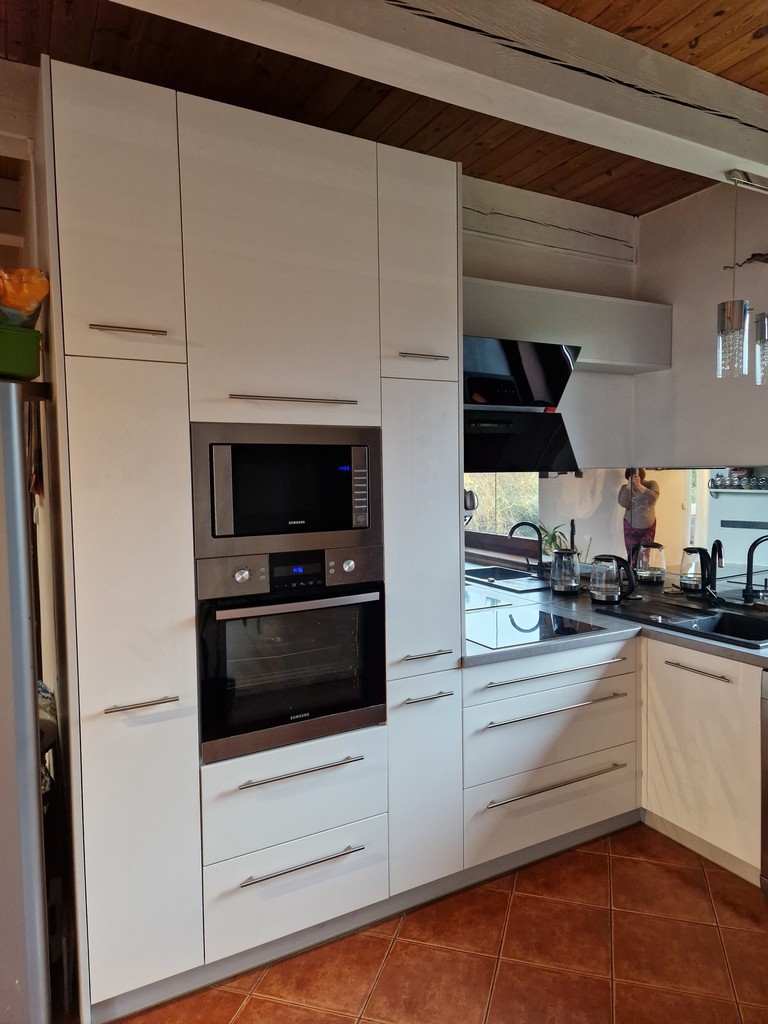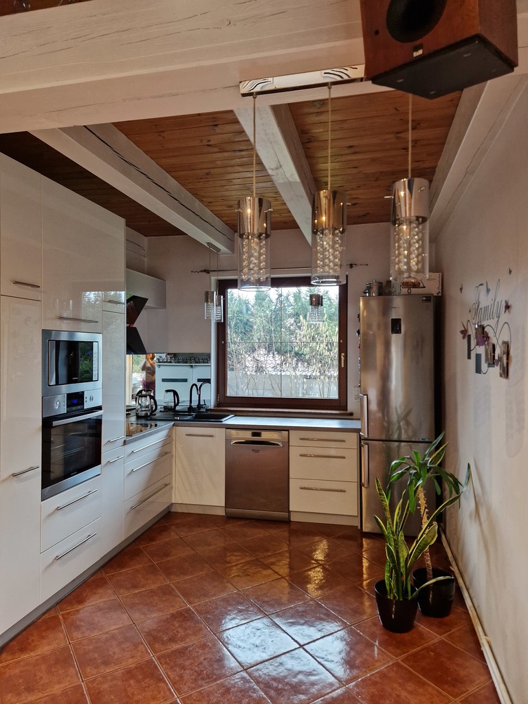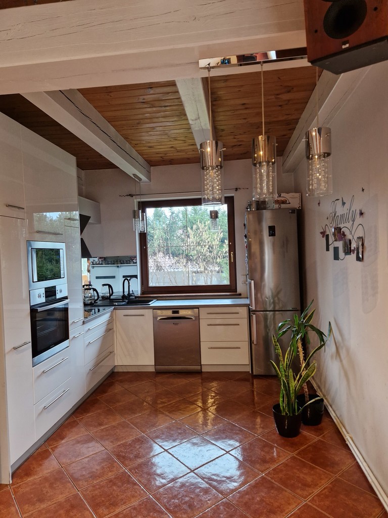 Spójna przestrzeń: salon połączony z otwartą, funkcjonalną kuchnią z pełnym wyposażeniem doświetloną oknem. Kominek, z salonu bezpośrednie wyjście na taras i ogród.