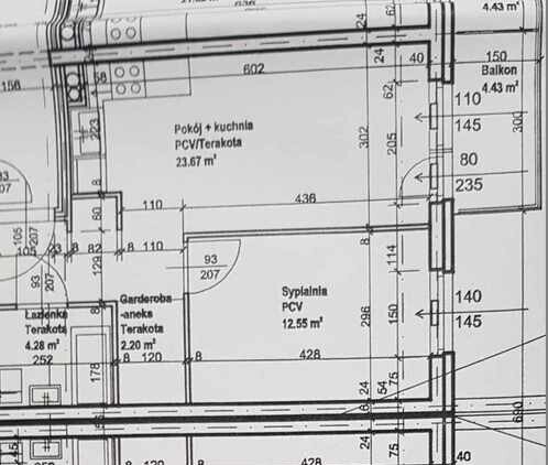 – salon z aneksem kuchennym ( 23,67 m2 ) z wyjściem na balkon ( 4,43 m2 ) od strony południowej z pięknym widokiem na panoramę miasta,