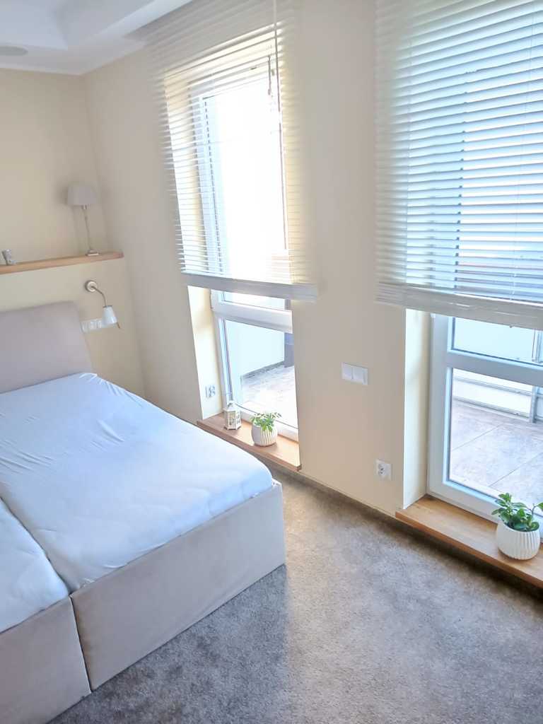 Apartament jednopoziomowy, o południowo-zachodniej wystawie okien został indywidualnie zaprojektowany i składa się z części dziennej oraz nocnej, 2 balkony, duża loggia i sucha sauna.