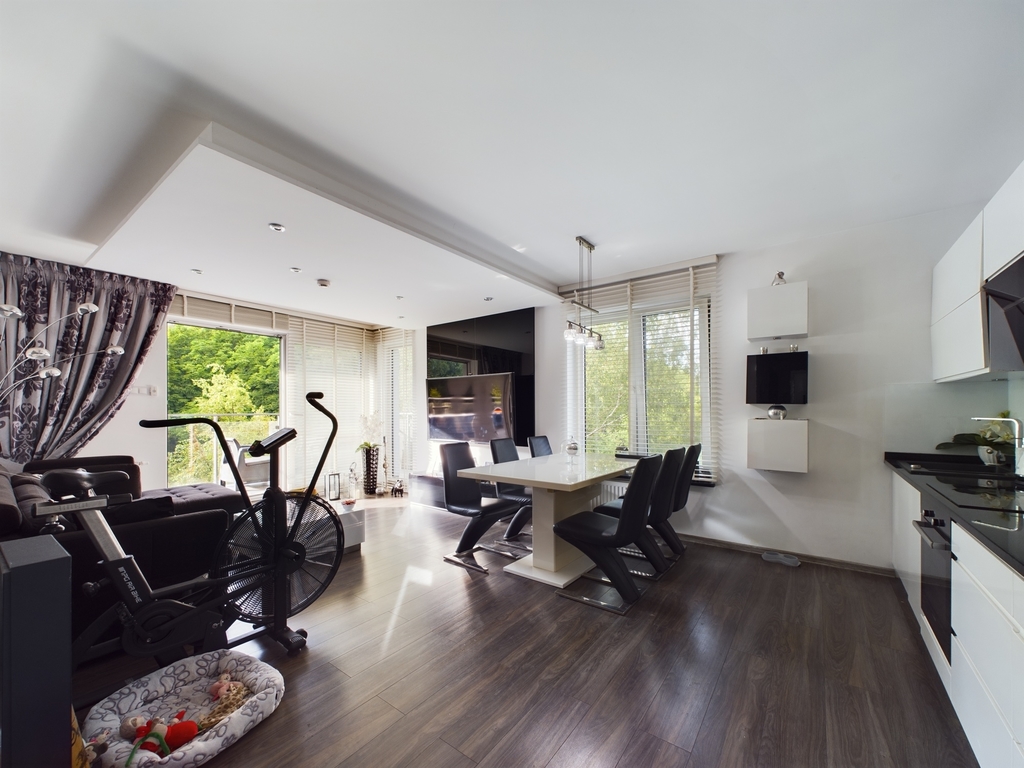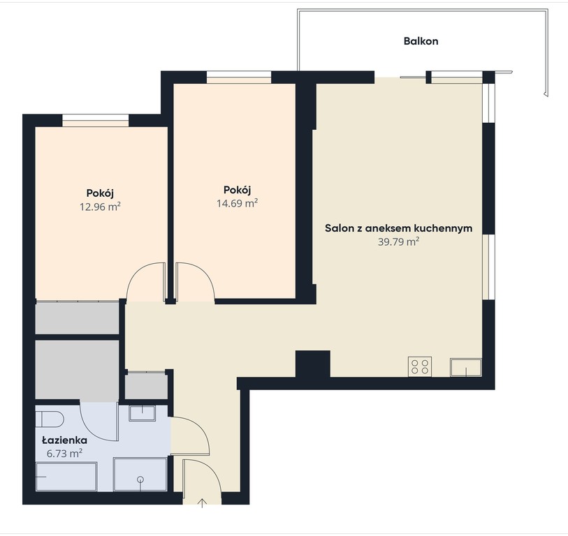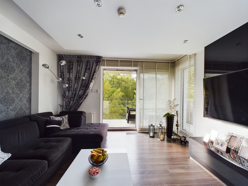– Jasny przestronny salon z aneksem kuchennym, z którego przedostać możemy się również na balkon,