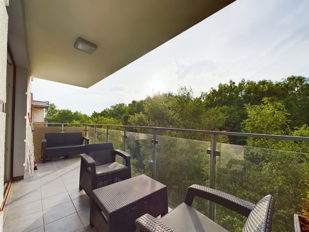 który stanowi serce mieszkania, dwóch przytulnych sypialni, łazienki z wanną oraz balkonu. Każde