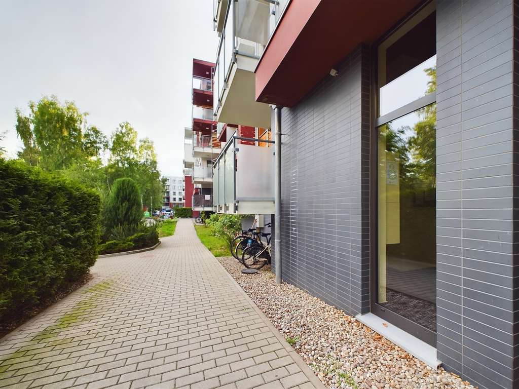 Dobra infrastruktura osiedla: basen zewnętrzny z podgrzewaną wodą, fitness, saunarium, bawialnia oraz plac zabaw.