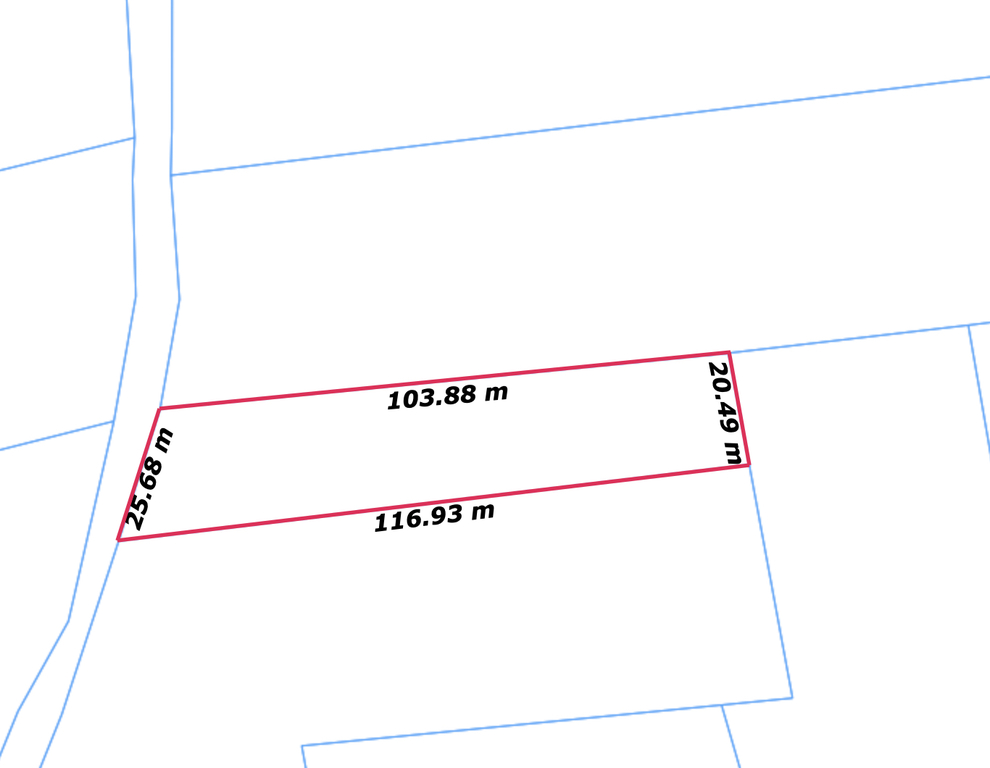 Nieruchomość kształtem zbliżona do prostokąta, o wymiarach podanych na zdjęciu w ofercie. (WYMIARY SĄ ORIENTACYJNE)
