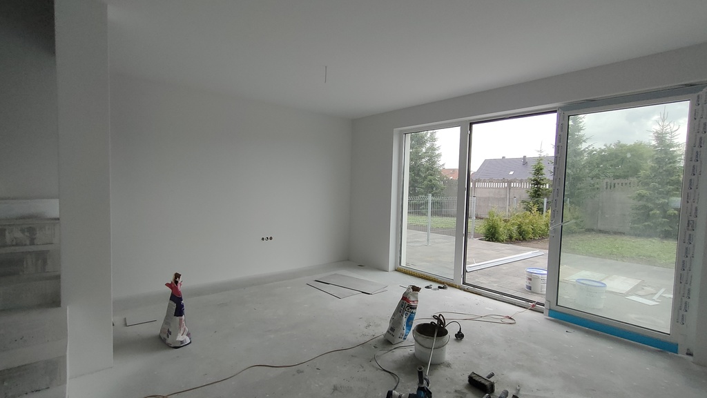 Powierzchnia działki wynosi około 350 m2. Działka częściowo ogrodzona. Na wjeździe możliwość parkowania samochodu. Budynek posiada bardzo dobre parametry termiczne. Okna PCV trzyszybowe. W salonie na parterze możliwość podłączenia kominka. Ściany zewnętrzne i wewnętrzne nośne z betonu komórkowego. Ściany wewnętrzne z bloczków gazobetonowych o grubości 12 cm. Ogrzewanie podłogowe. W cenie piec co dwuobiegowy z zamkniętą komorą spalania. Budynek oddzielony jest od drugiego ścianą i warstwą izolacji. Drzwi zewnętrzne do budynku antywłamaniowe. Zakończenie stanu deweloperskiego przewidziane na 2025 rok. Działka ogrodzona siatką z trzech stron.