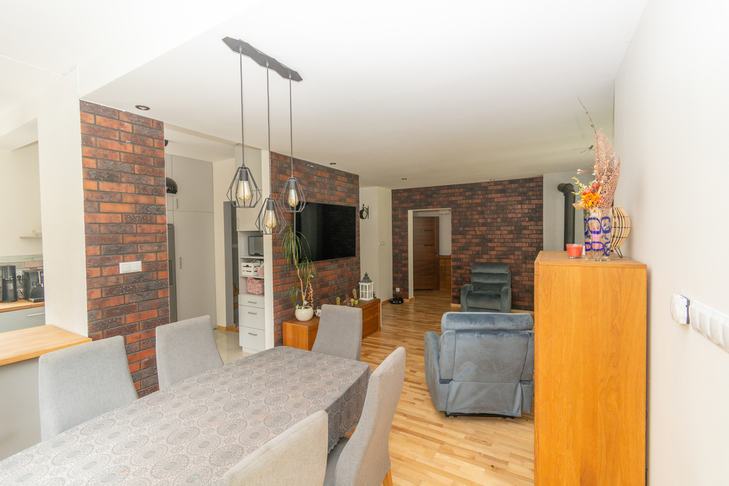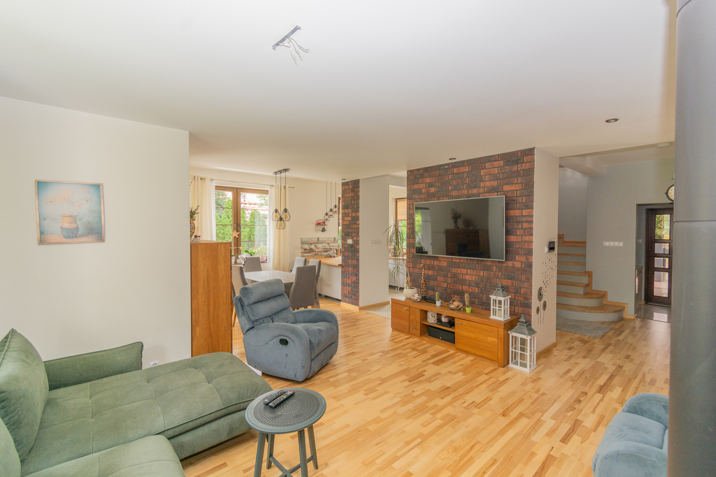 • Salon z kominkiem, otwarty na kuchnię i jadalnię z wyjściem na taras (ok. 40 m²)
