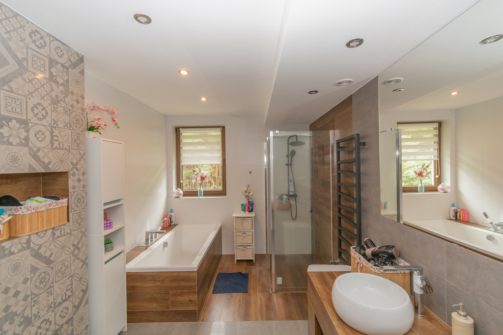 • Duża łazienka z prysznicem, wanną i dwiema umywalkami