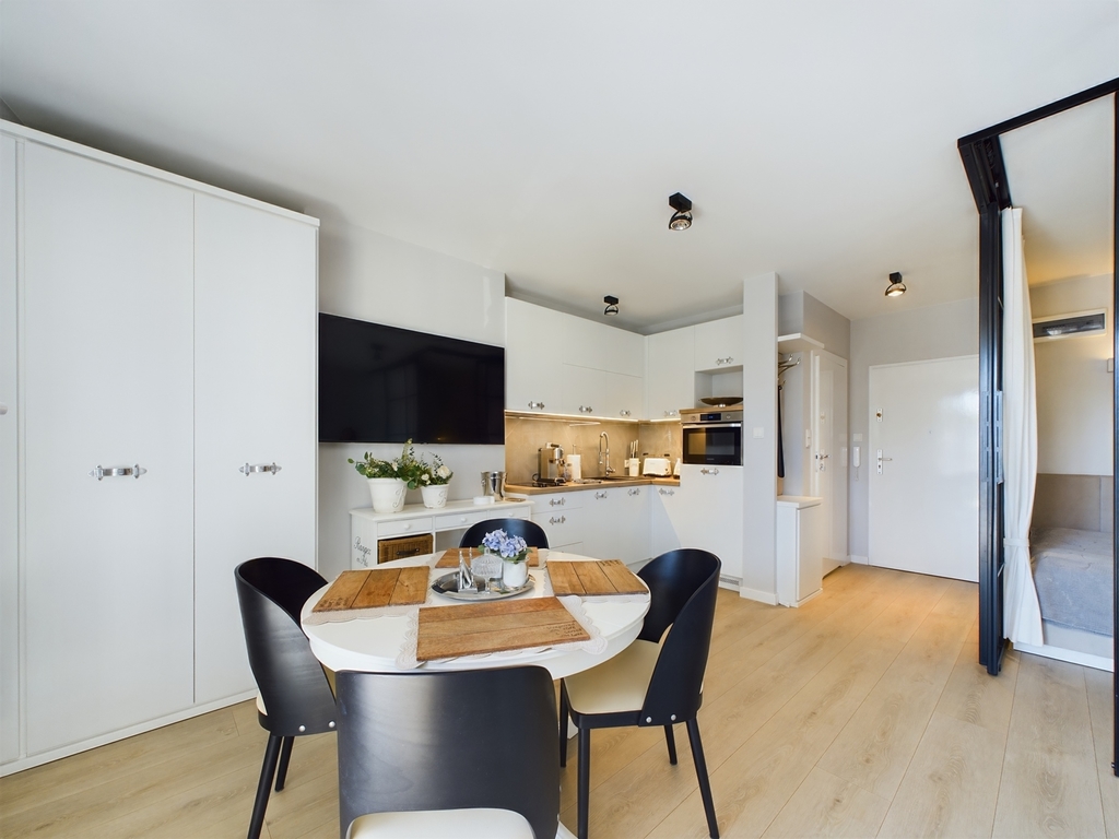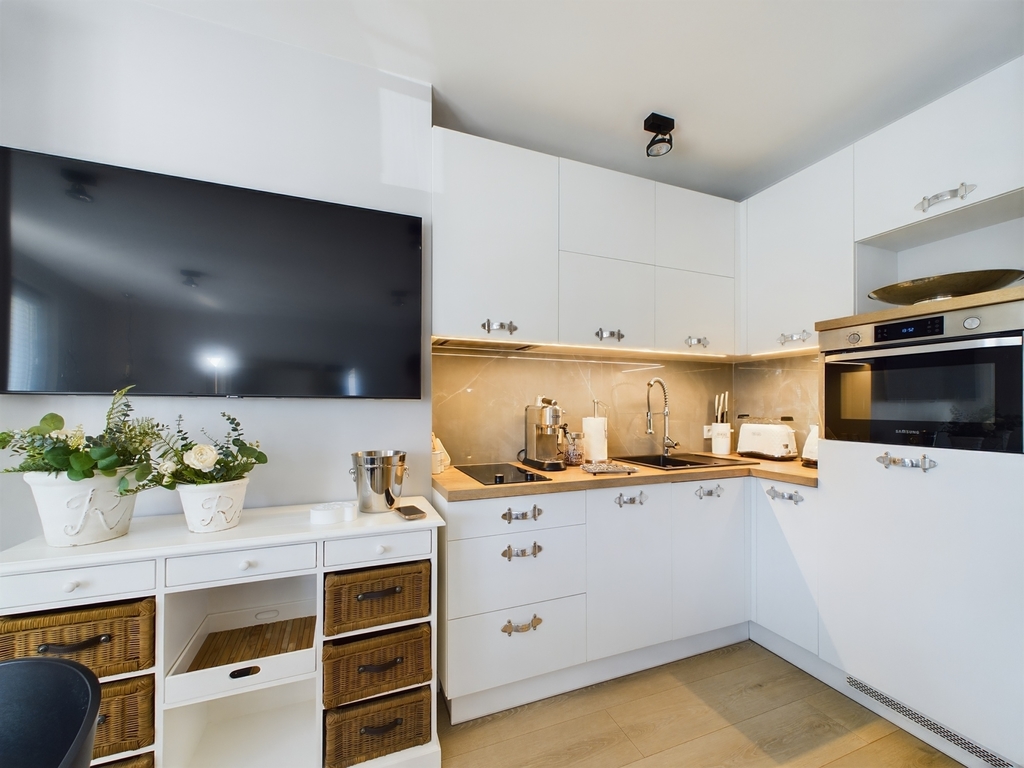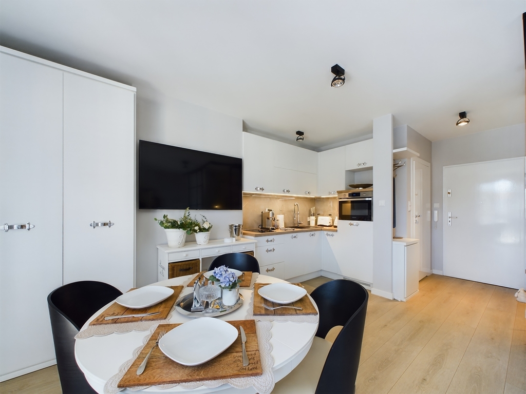 – W pełni wyposażony aneks kuchenny (meble w kolorze alabastrowym ze sprzętem AGD, w którego skład wchodzą: lodówka, zmywarka, okap. płyta grzewcza, piekarnik, ekspres do kawy.)