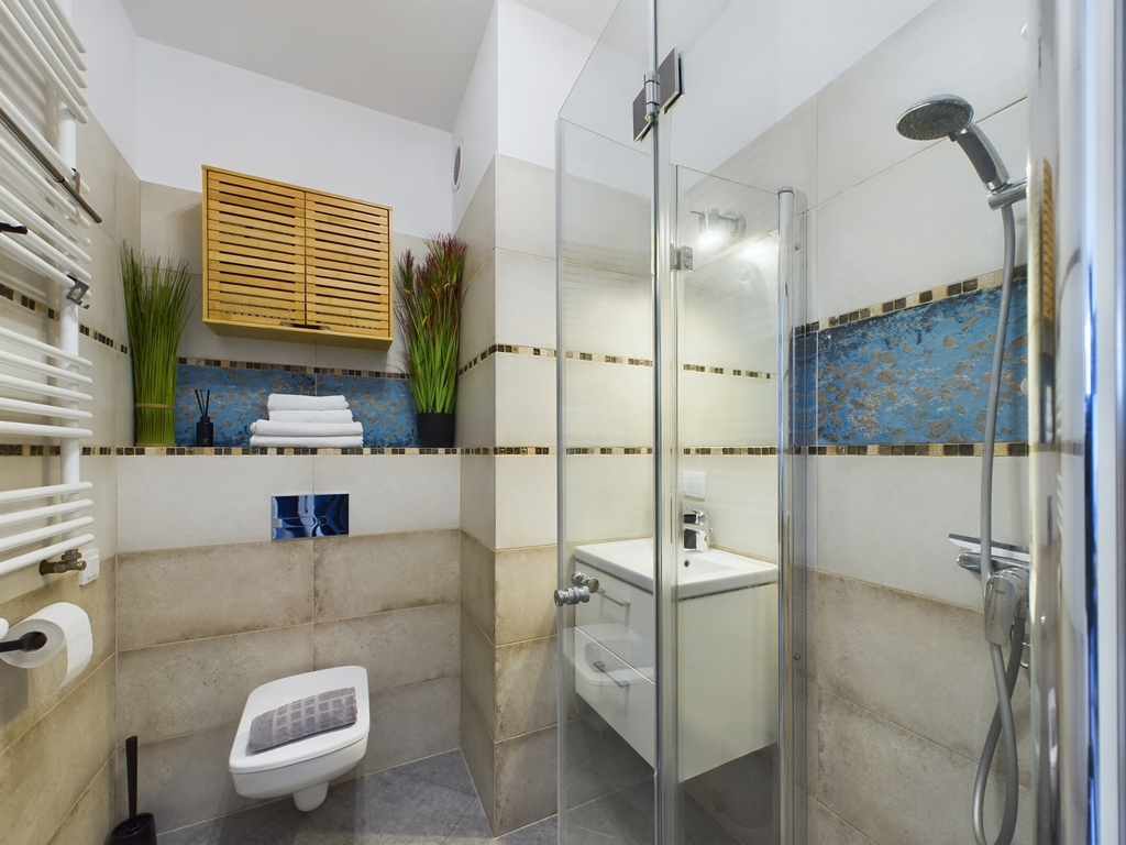 – Łazienka: Duża łazienka z nowoczesnym prysznicem, która zapewnia komfort i wygodę.