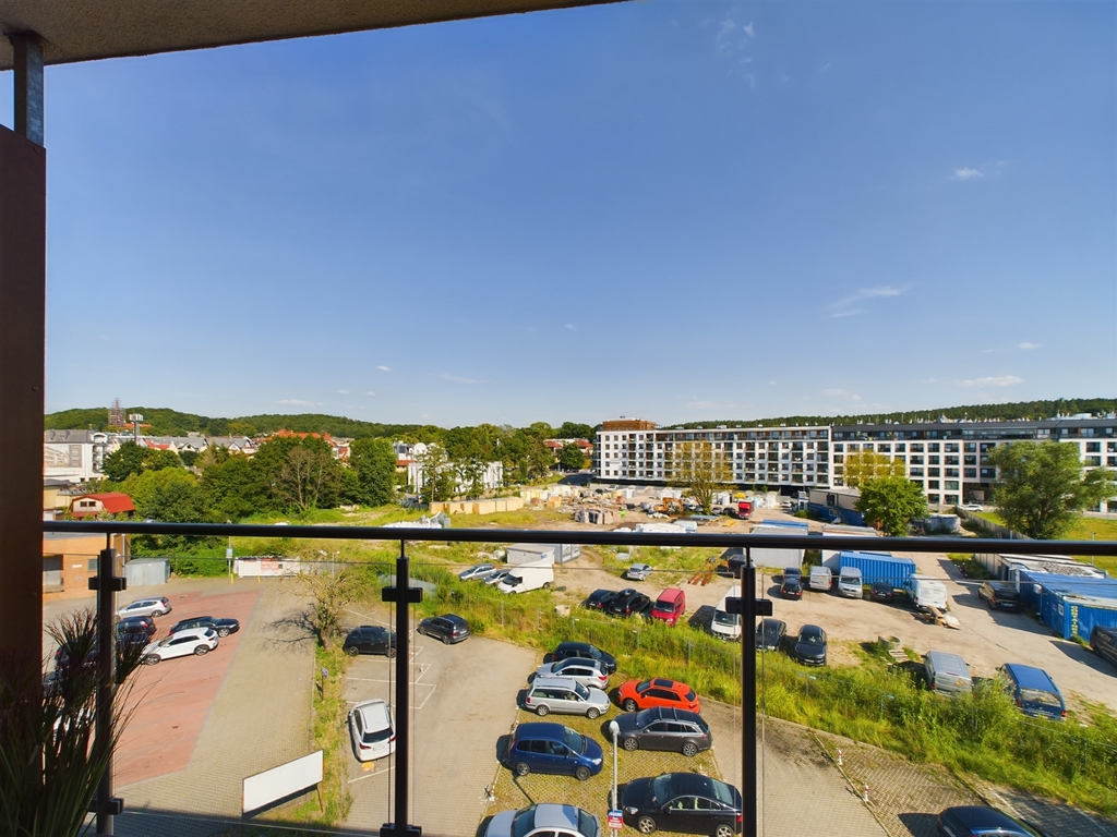 – Balkon tarasowy typu loggia: Przestronny balkon wyposażony w meble tarasowe oraz stolik. Oddzielona przestrzeń gwarantuje niezwykłą prywatność, umożliwiając relaks na świeżym powietrzu. Z balkonu rozpościera się przepiękny widok na ratusz, pobliski sklep Netto oraz w oddali zieleń drzew.