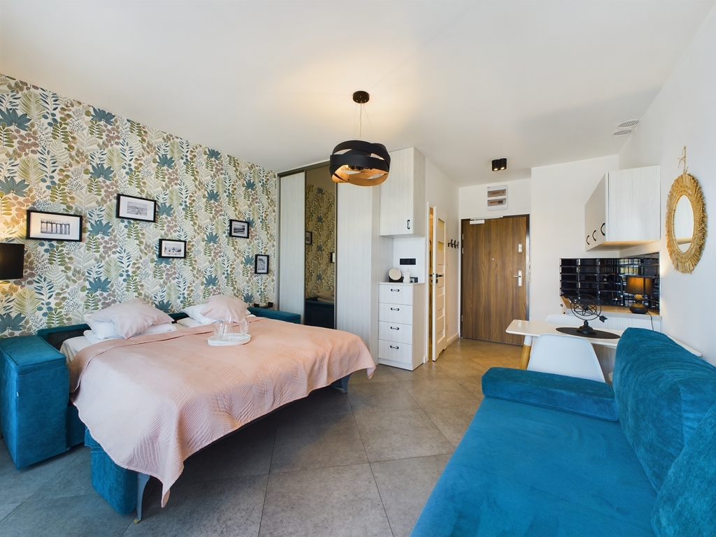 – Pokój: Przestronny, jasny pokój, który pełni funkcję sypialni i salonu. Znajduje się w nim wygodne łóżko sypialniane oraz rozkładana kanapa, co zapewnia komfortowy wypoczynek dla większej liczby osób. W pokoju wydzielona została również część jadalniana, idealna na rodzinne posiłki czy spotkania towarzyskie.