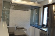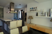 Z salonu wyjście na ogród i taras. Na podłogach panele i terakota. Meble kuchenne w zabudowie wraz ze sprzętem AGD firmy Siemens oraz Bosch: lodówka z zamrażarką, zmywarka 60 cm, płyta ceramiczna, piekarnik.