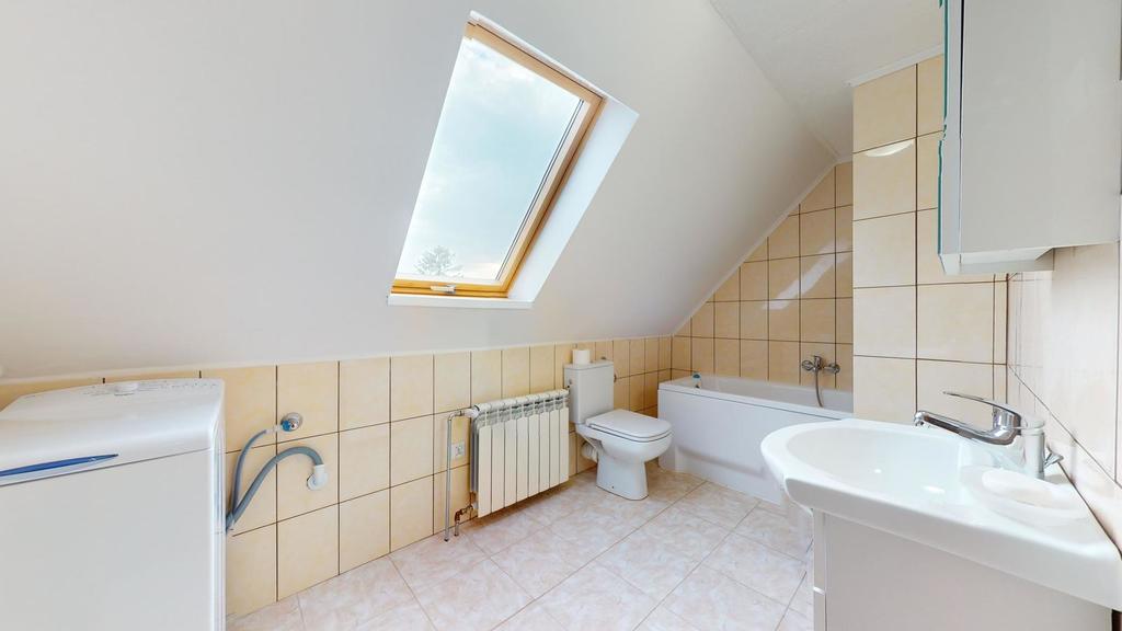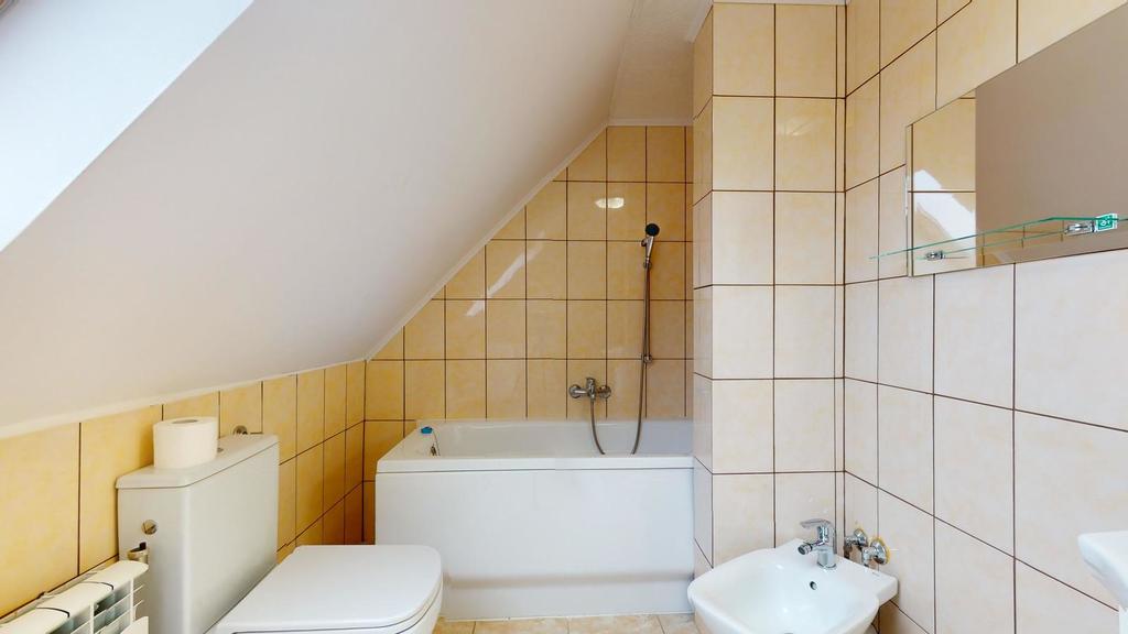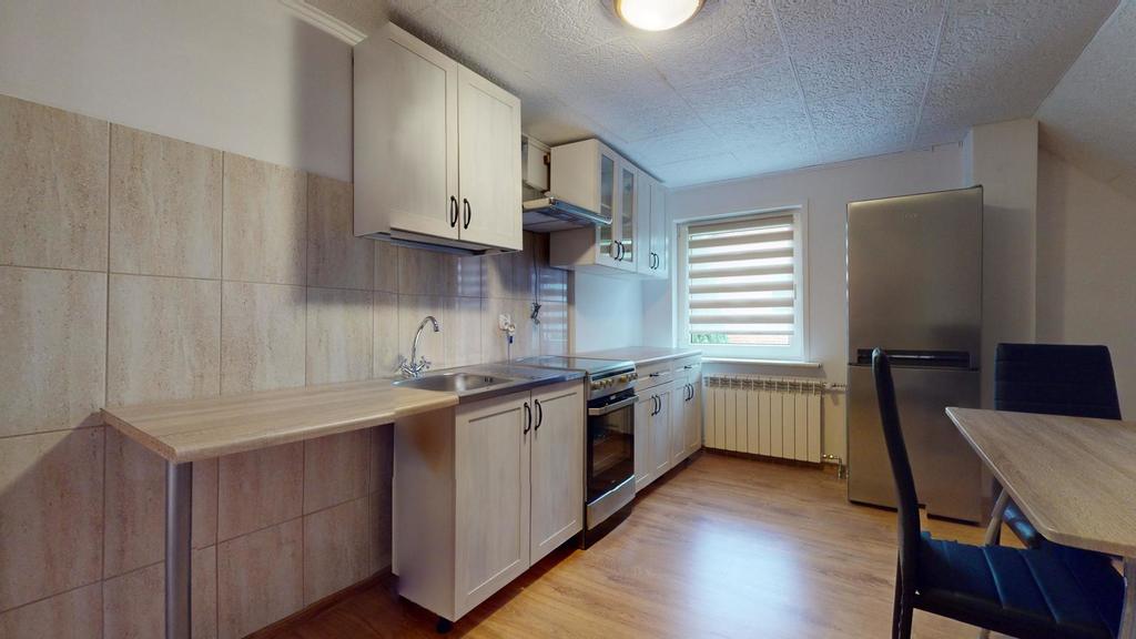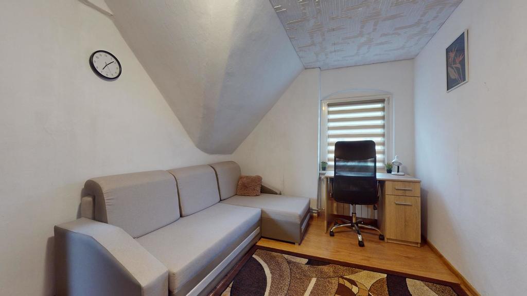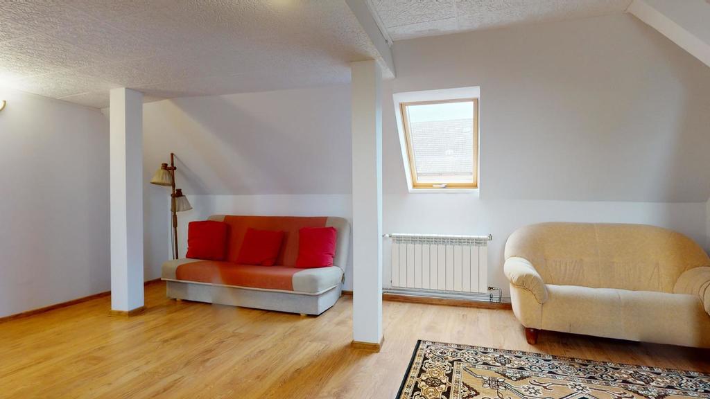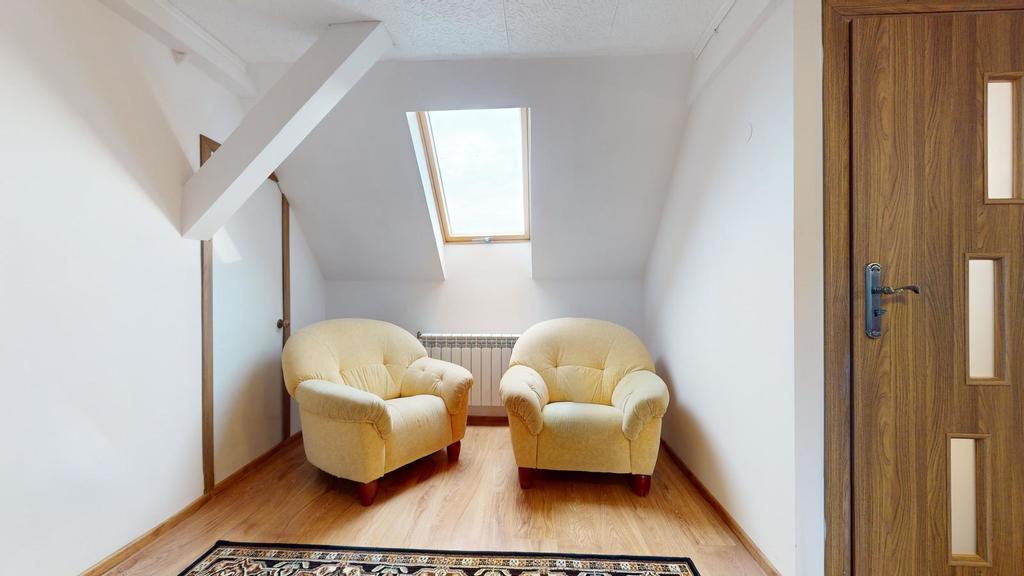 Na poddaszu jest trzecie mieszkanie z dużym pokojem dziennym, sypialnią, kuchnią i łazienką.