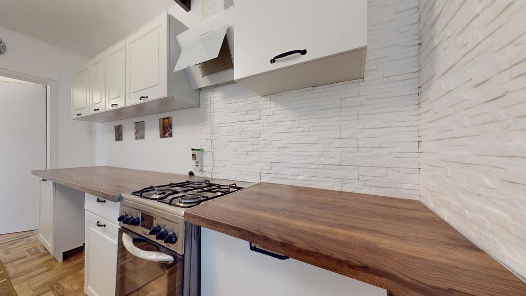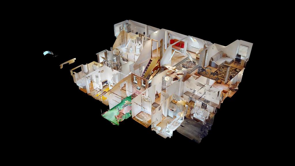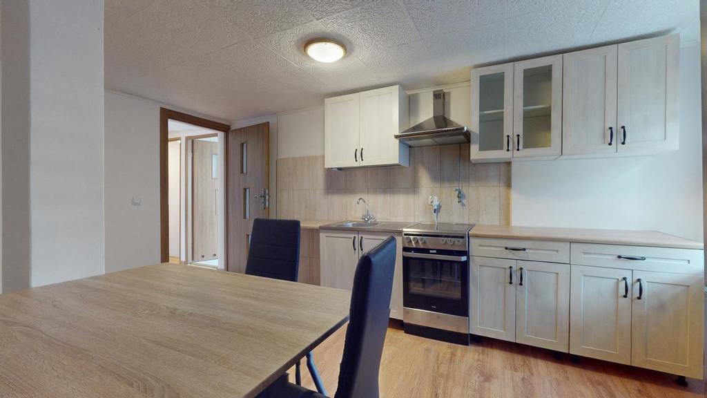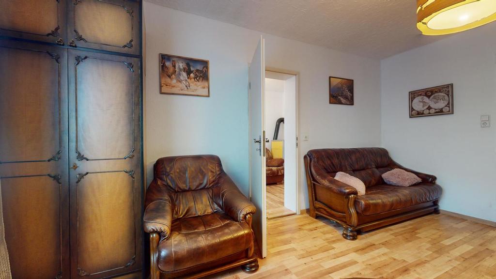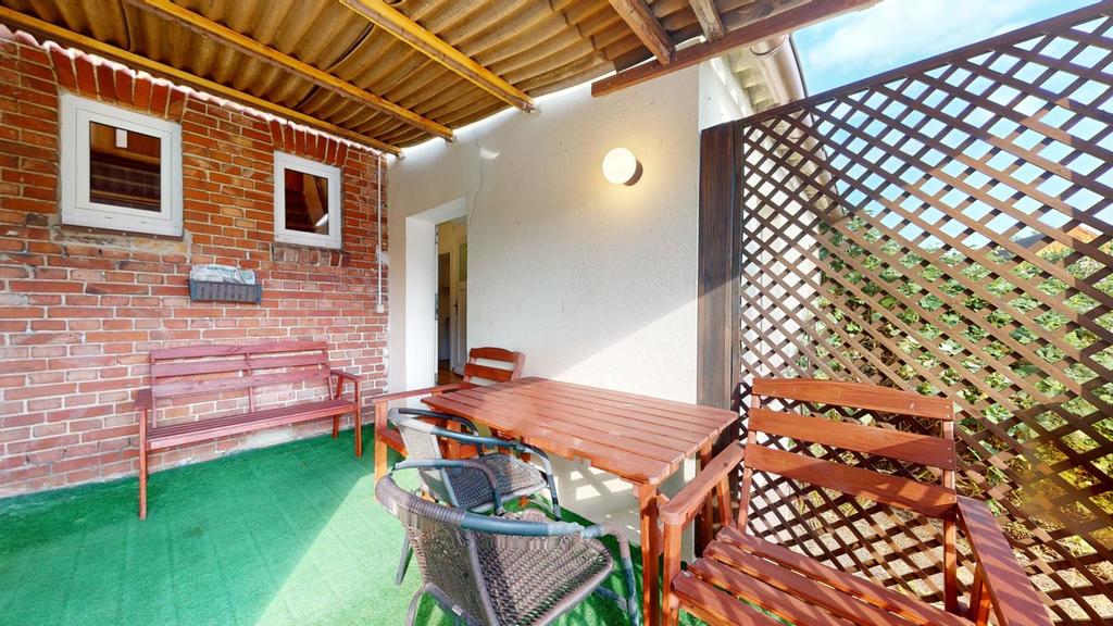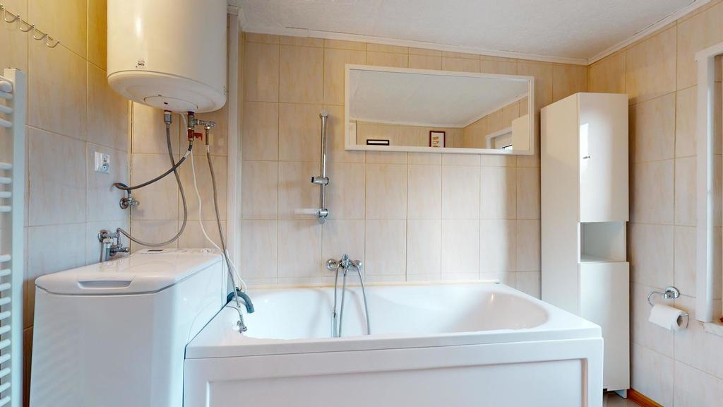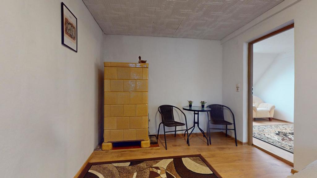 Na poddaszu jest trzecie mieszkanie z dużym pokojem dziennym, sypialnią, kuchnią i łazienką.