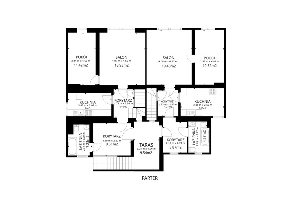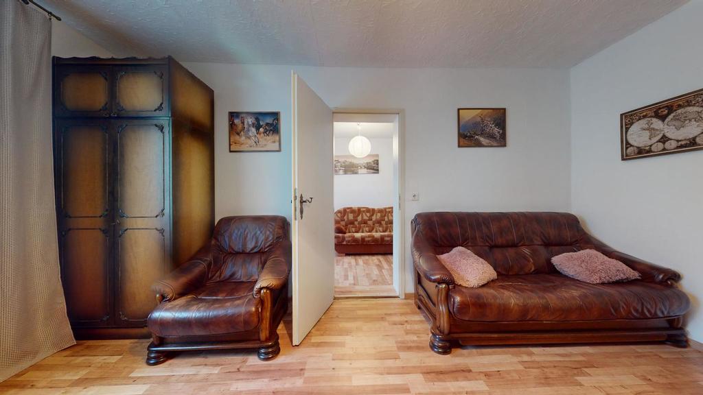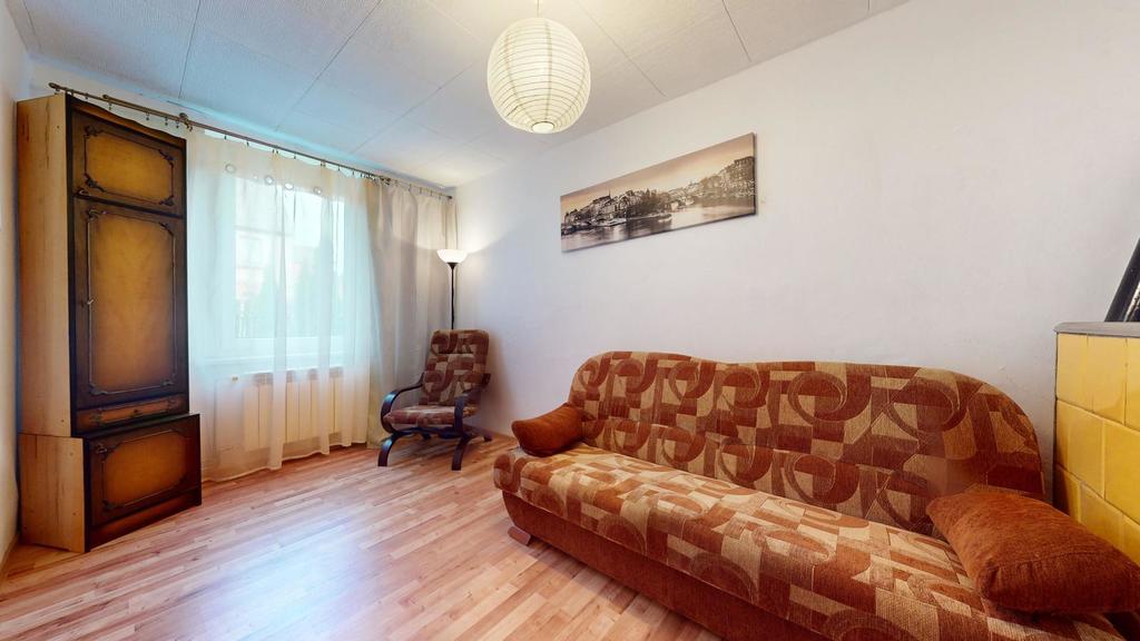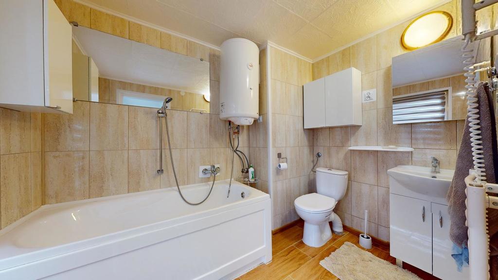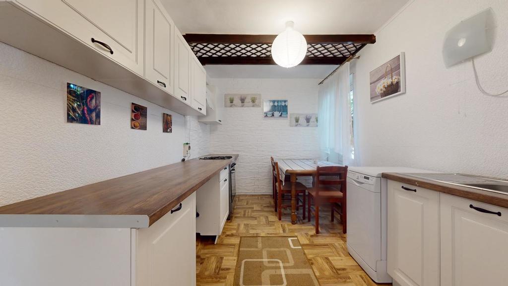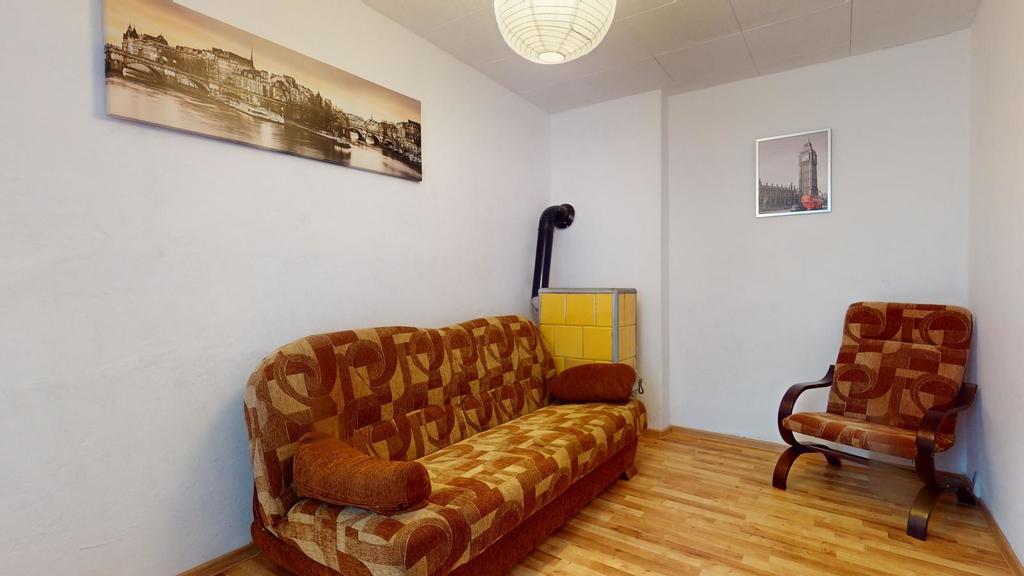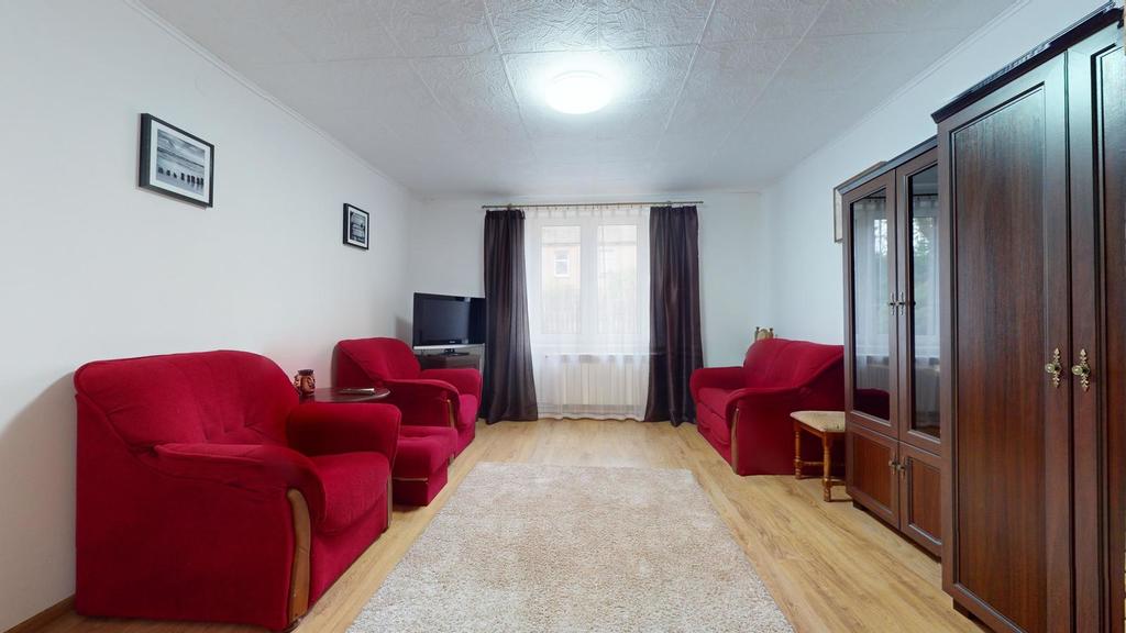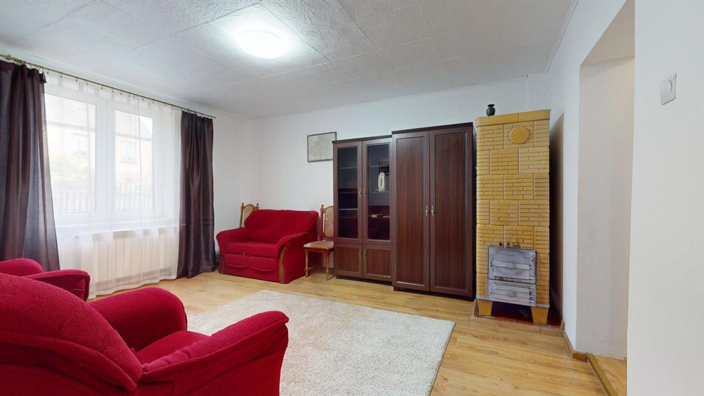 Na parterze znajdują się dwa oddzielne mieszkania ze wspólną drewnianą werandą, w każdym z nich przedpokój, sypialnia, przestronny pokój dzienny, kuchnia, łazienka, dodatkowy pokój.