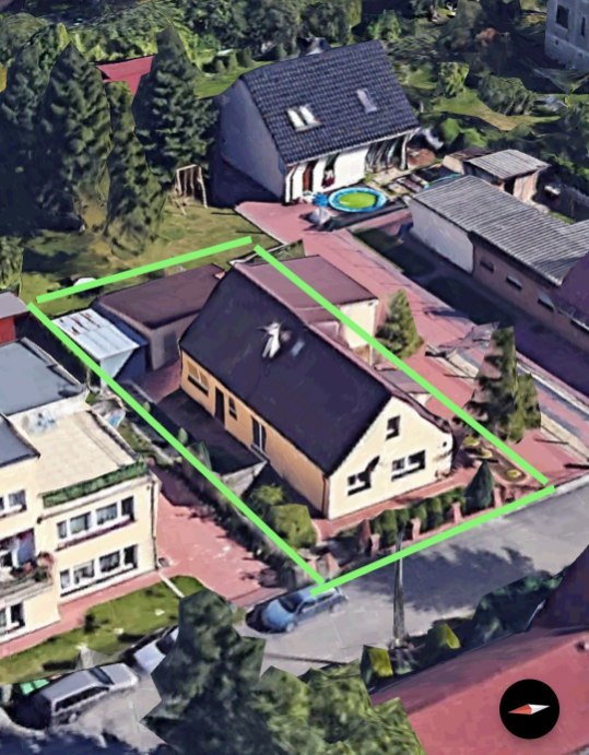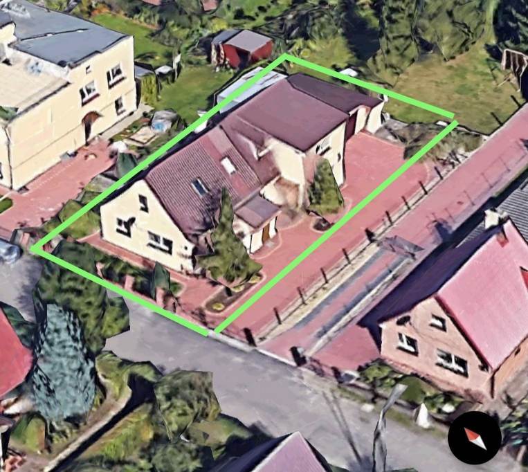 Posiada trzy wejścia (dwa aktywne), trzy łazienki, dwie kuchnie, salon i pięć pokoi. Na zewnątrz murowane pomieszczenie gospodarcze oraz garaż blaszany jako drugie pomieszczenie gospodarcze, altana ogrodowa, kostka brukowa, miejsce na taras przy kuchni.