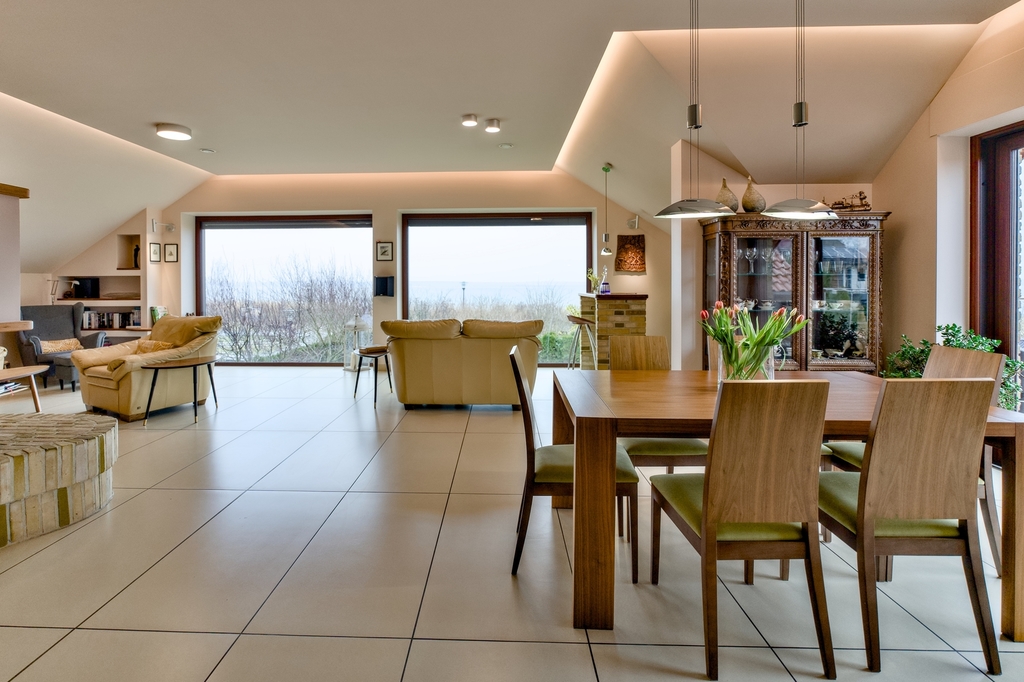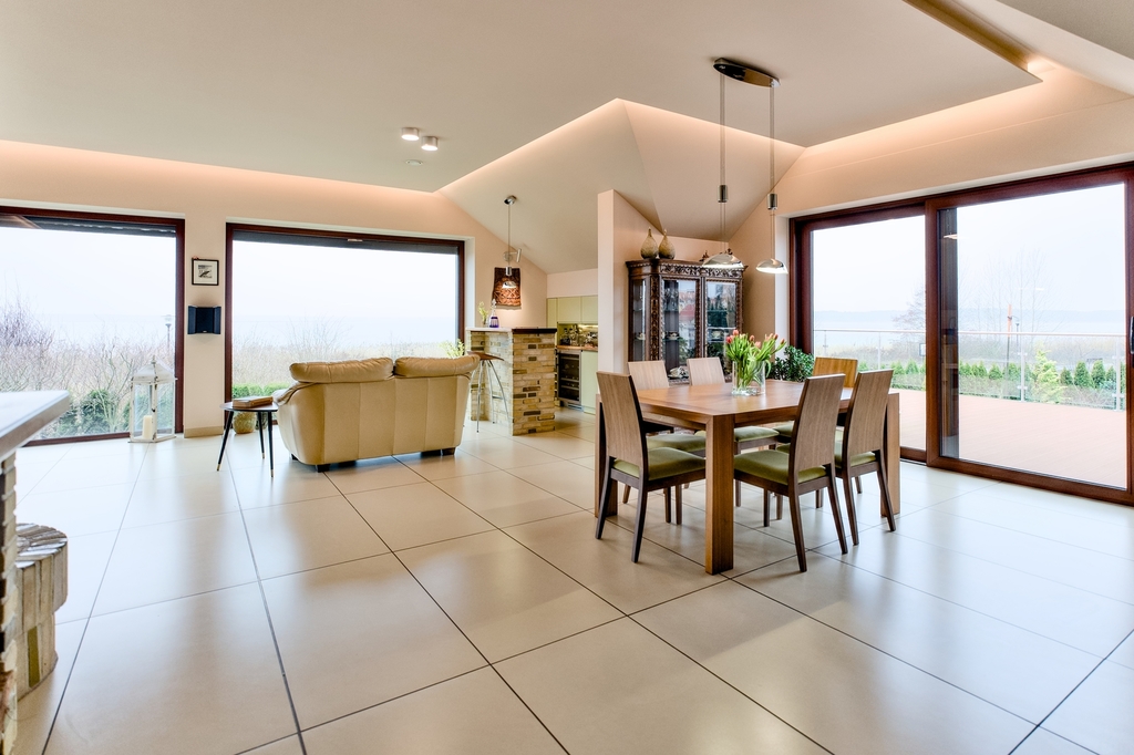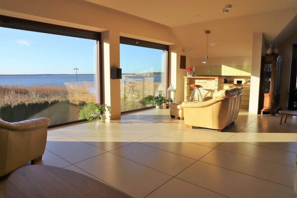 – salon połączony z jadalnią z wyjściem na duży taras 80 m2 z widokiem na jezioro