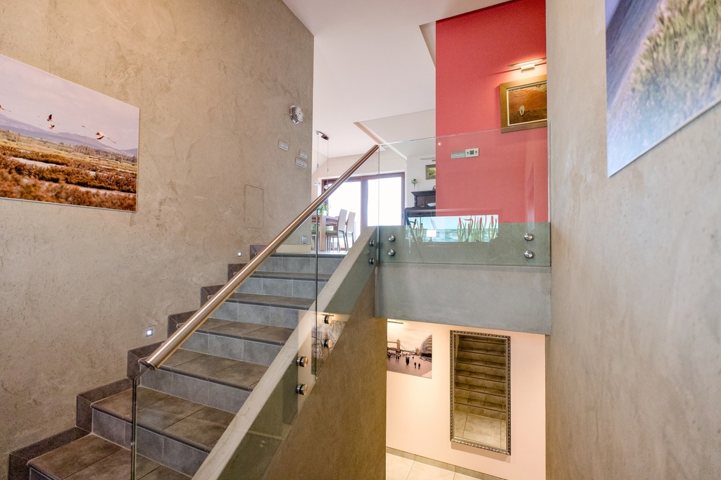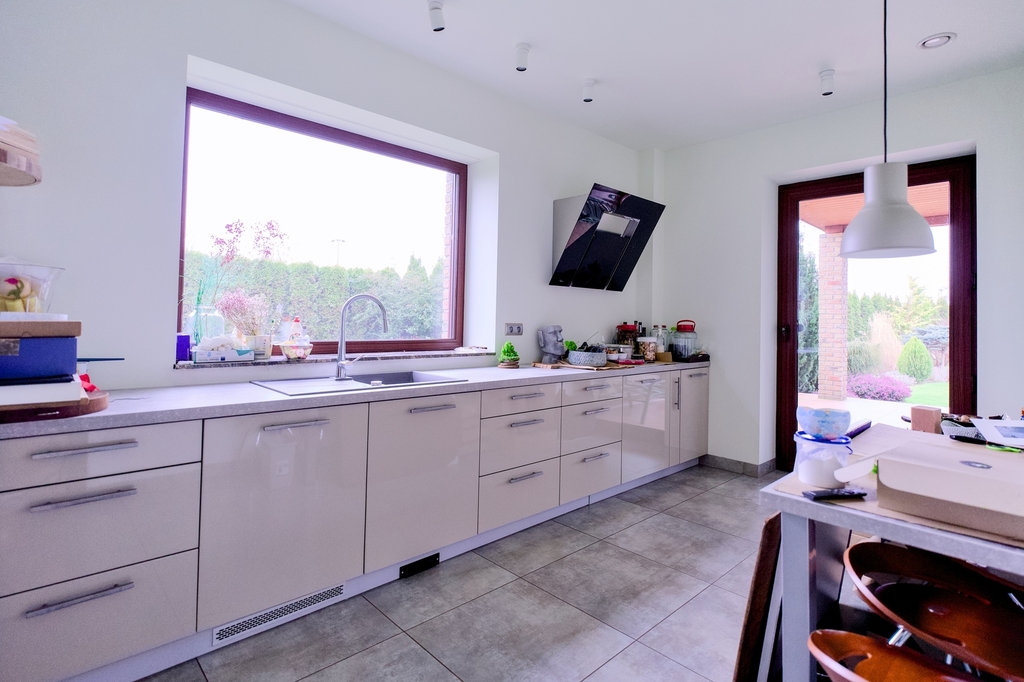 Stolarka okienna PCV – potrójne szklenie, antywłamaniowe szyby P4/9, 5-14-4-12-5 U= 0,7 (współczynnik cieplny), rolety zewnętrzne aluminiowe. Instalacja alarmowa z kamerami.