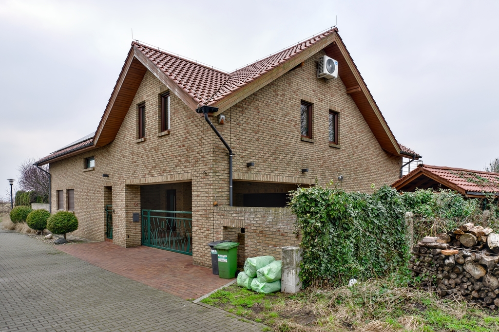 Dom wybudowany metodą tradycyjną murowaną. Ściana w konstrukcji trójwarstwowej (Porotherm 24 + 15cm ocieplenie wełna + 2cm pustka powietrzna + 11cm cegła elewacyjna klinkierowa), posadowiony na płycie fundamentowej żelbetowej wylanej na 24 palach .