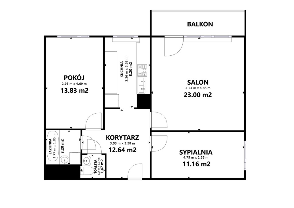 Przestronne trzypokojowe mieszkanie o powierzchni 67,77 m2 składa się z: