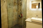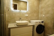 – Łazienka o powierzchni 4,4 m2 uposażona w umywalkę nad którą znajduje się podświetlane lustro, kabinę prysznicową oraz pralkę, na podłodze laminat.