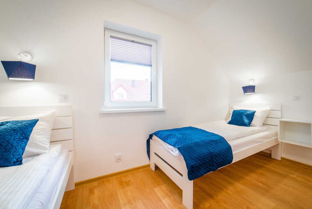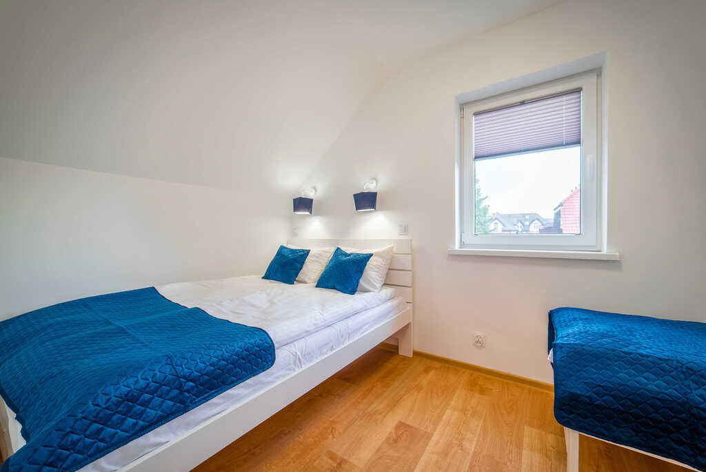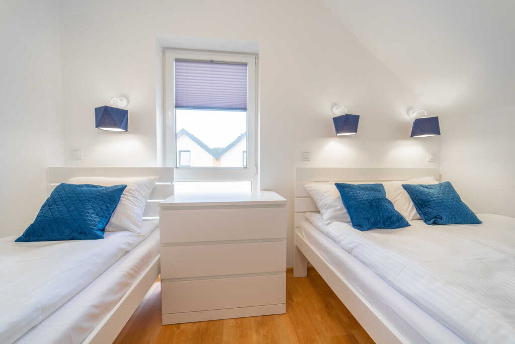 Rozkład domku: – Parter: Pokój dzienny (kanapa, stolik, szafa, telewizor), aneks kuchenny (w pełni wyposażony: lodówka, płyta indukcyjna, czajnik, ekspres do kawy, toster, talerze, sztućce, szklanki, garnki; stół z krzesłami), łazienka (kabina prysznicowa, wc, umywalka), taras (zadaszenie w formie markizy, grill, meble ogrodowe) – Poddasze: Sypialnia (łóżko pojedyncze, łózko podwójne, komoda), sypialnia (łóżko pojedyncze, łóżko podwójne, komoda, szafa), toaleta. – Na wyposażeniu domków: leżaki, parawany, parasole, pościel, ręczniki, dodatkowo: wszystkie akcesoria dla dzieci (łóżeczka, foteliki do karmienia, nocniki, bramki zabezpieczające, nakładki wc), wózki plażowe, żelazka, deski.