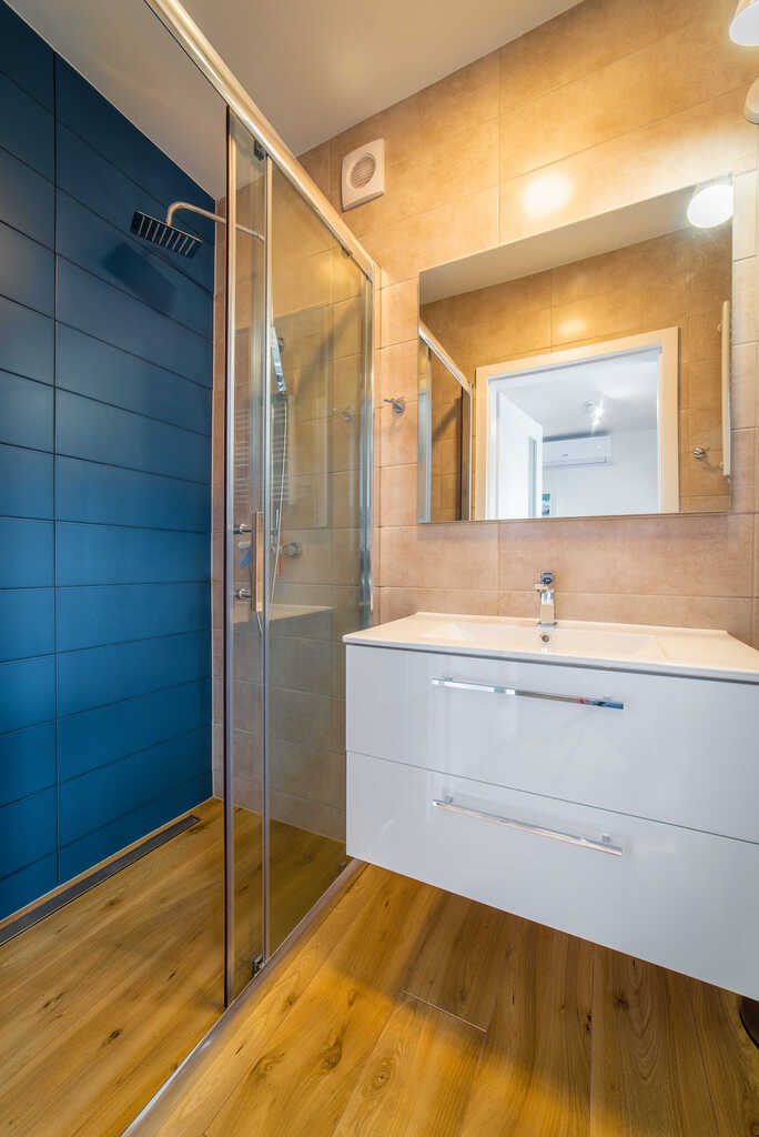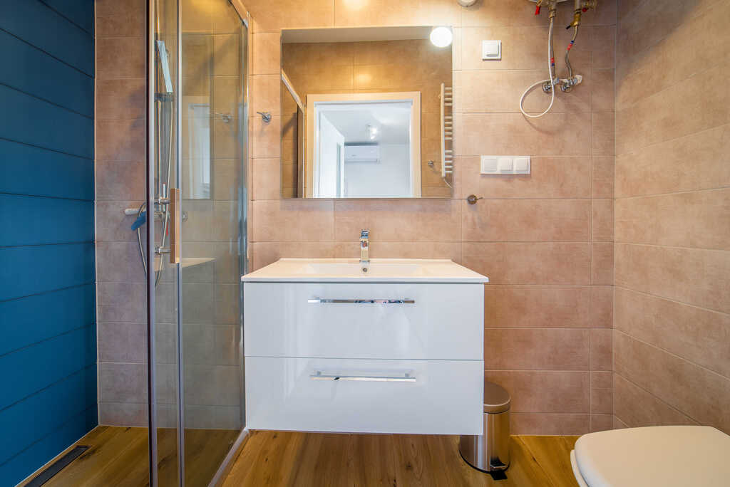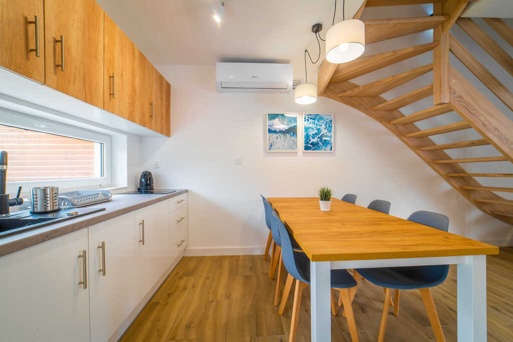 Domki na parterze składają się z pokoju dziennego z aneksem kuchennym oraz łazienki.