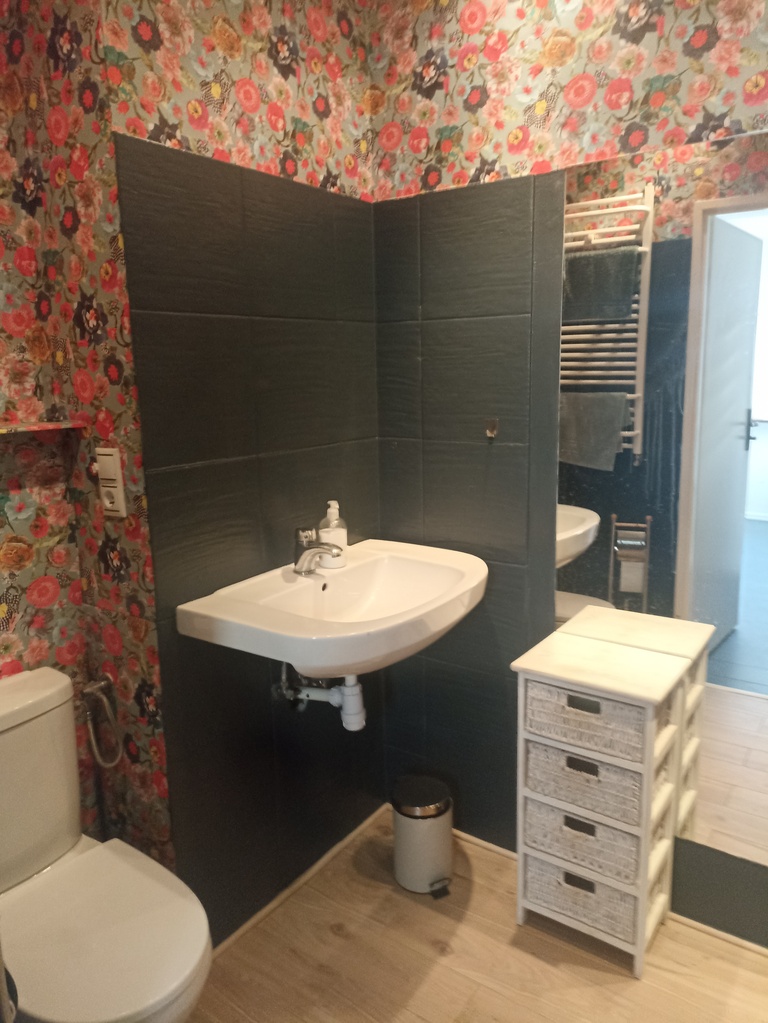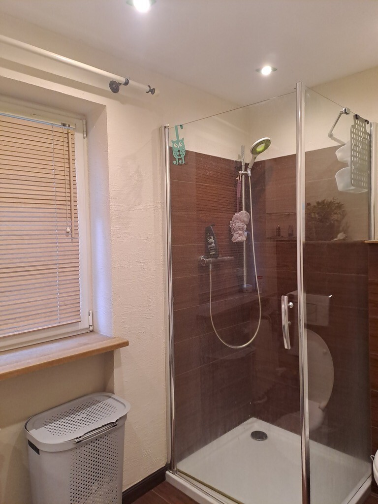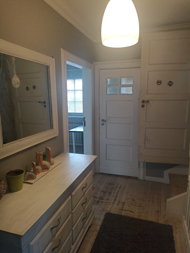 Piętro: przedpokój, salon z aneksem kuchennym (możliwość zlikwidowania kuchni i przywrócenia ok.12m2 pokoju z wejściem z przedpokoju), sypialnia z dużą szafą, łazienka z kabiną prysznicową razem z wc