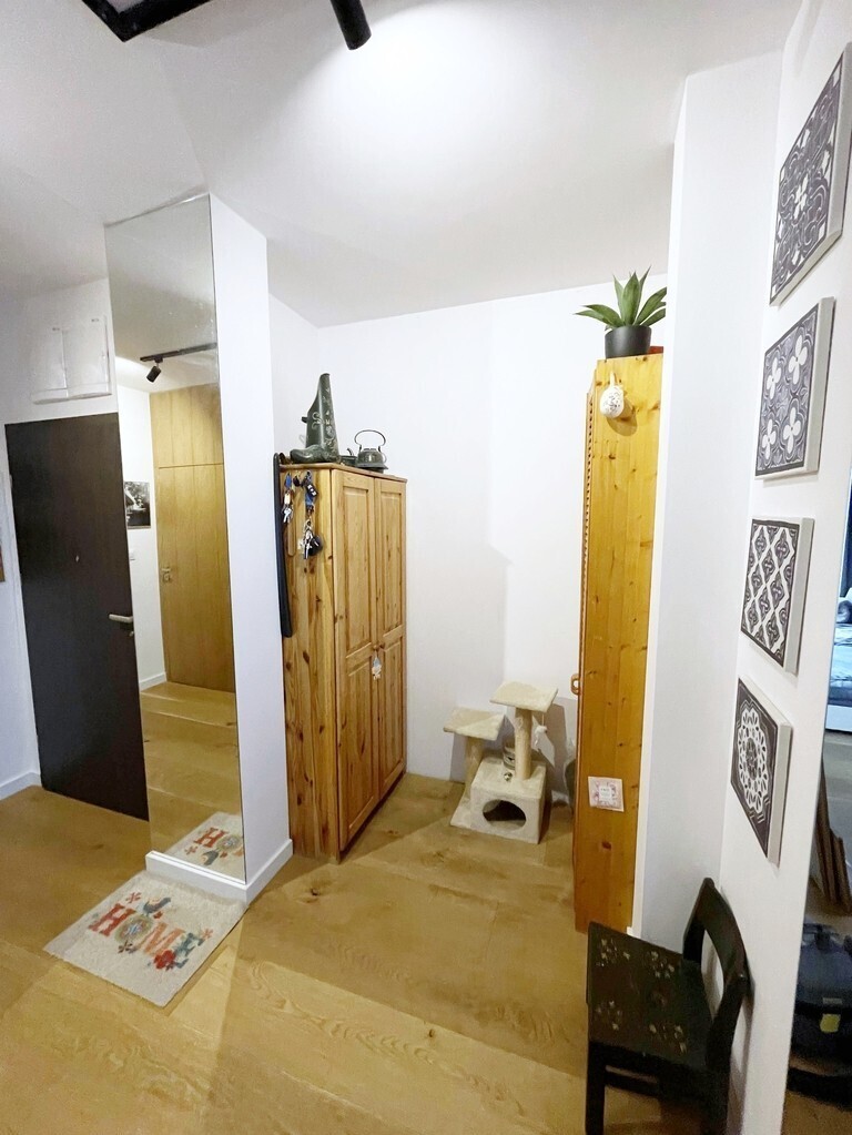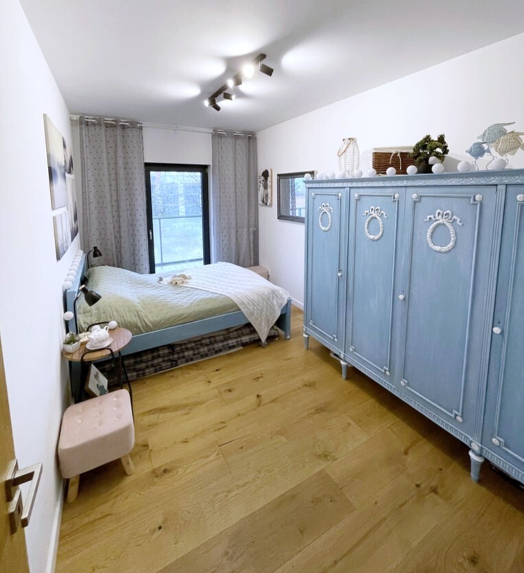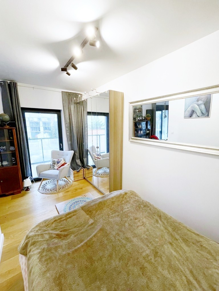 Apartament jest nowocześnie wykończony, z łazienką wyposażoną w kabinę prysznicową z odpływem liniowym wc i umywalkę oraz kompletnie wyposażonym i umeblowanym aneksem kuchennym ( meble w zabudowie, płyta kuchenna, zmywarka, lodówka) .