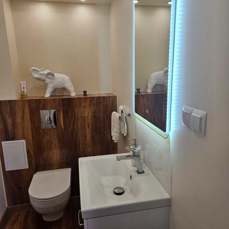 Dom ma dwa mieszkania. parter, kuchnia, pokój, łazienka oraz wejście do garażu (120 m2 ). Piętro z poddaszem (piętro: salon, kuchnia z jadalnią, WC, na poddaszu: sypialnia, łazienka i garderoba).